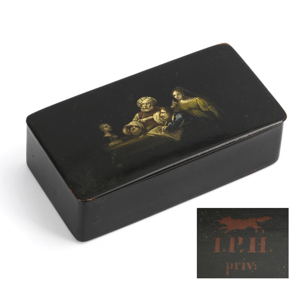 Square tabatiere; on the hinged lid painted scene with painting lessons in front of a bust. Small chips, some signs of age/use.