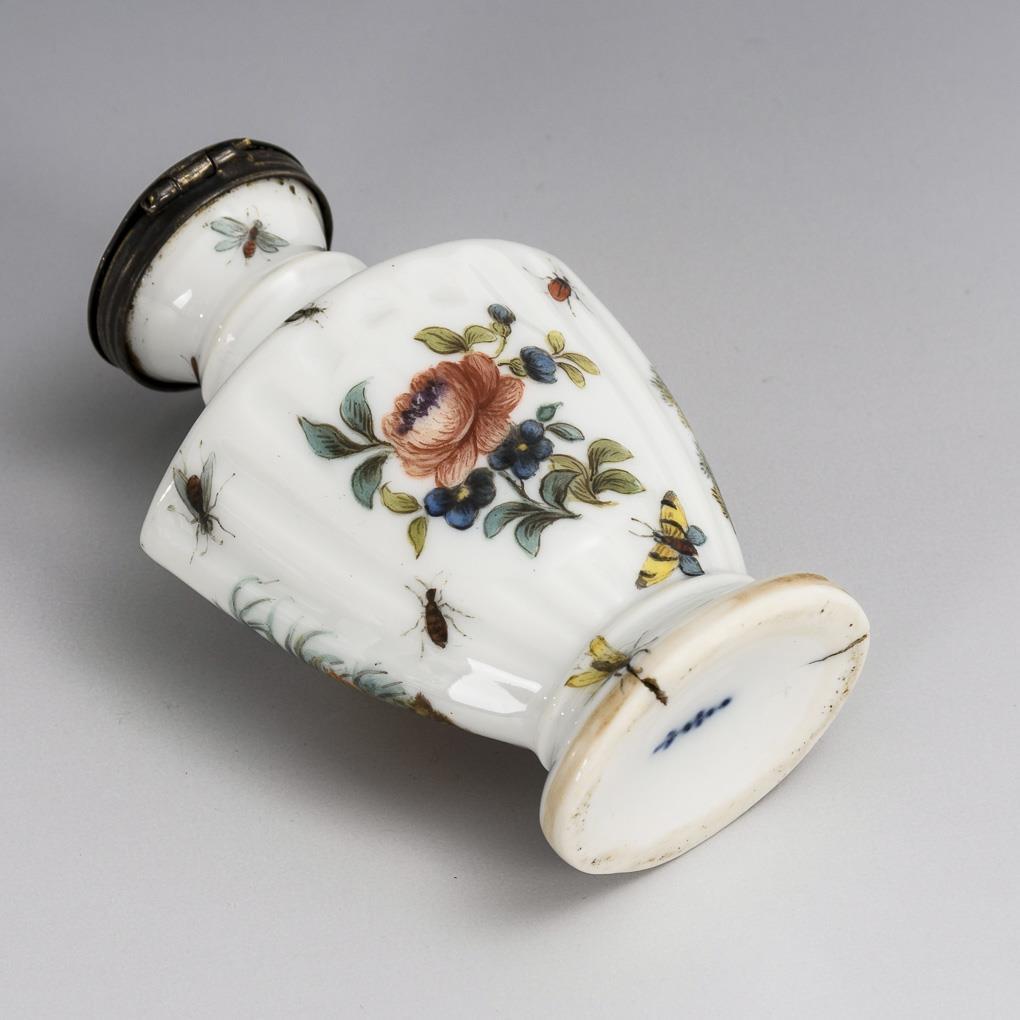 Flared, ogival body with foot and silver-mounted neck with hinged lid. On the front the representation of a rooster with hen and chicks, verso floral and insect painting. 2 fire cracks in the stand.