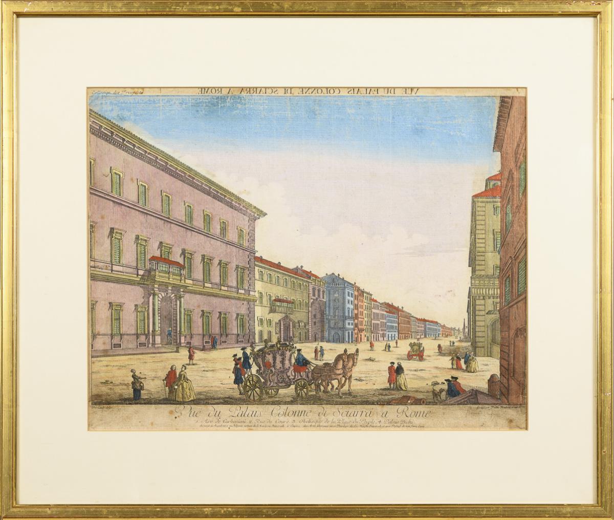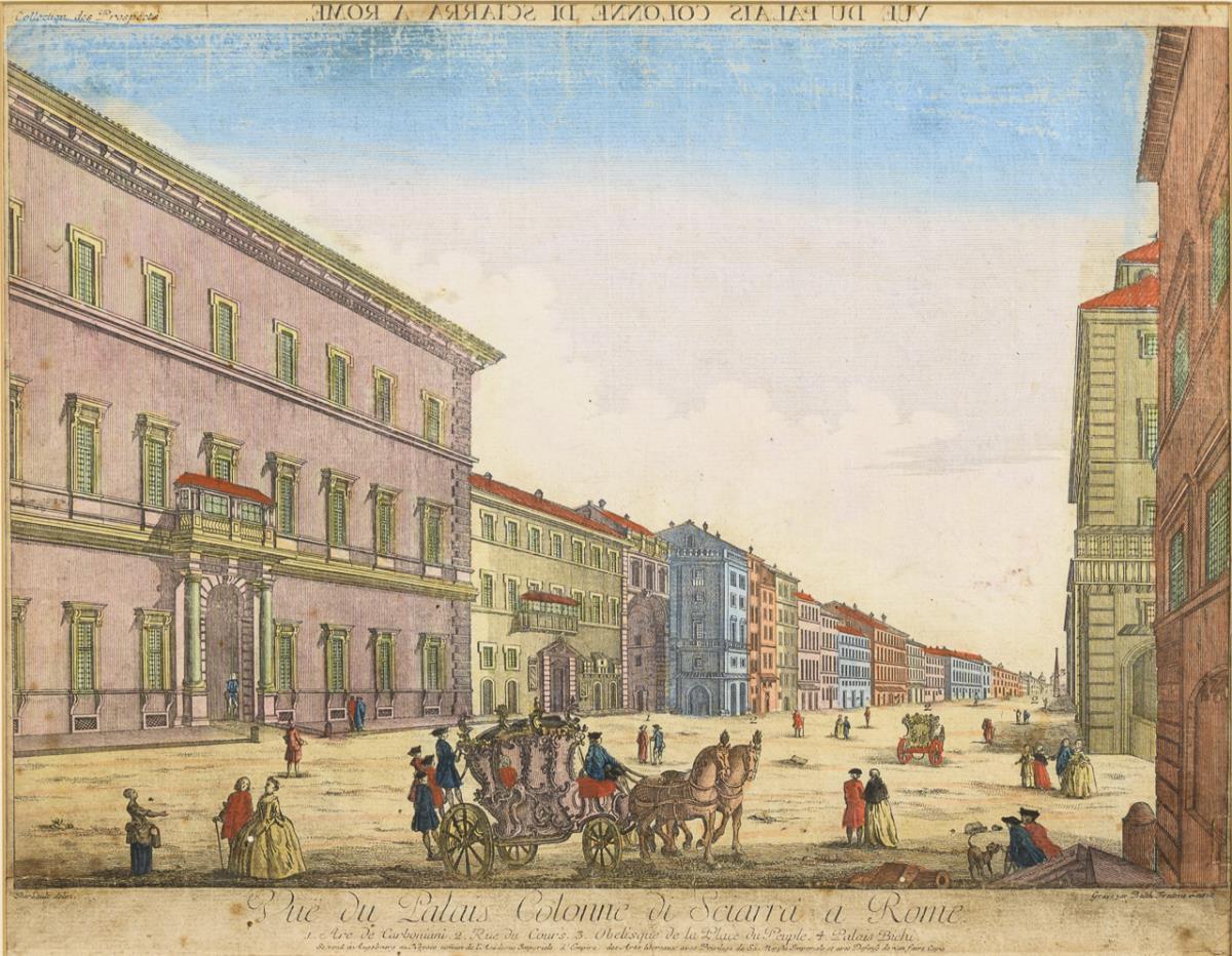 Side-inverted depiction of the Palazzo Sciarra in Rome with staffage figures and legend, inscribed "Vue du Palais Colonne di Sciarra a Rome". Heavily soiled and creased.