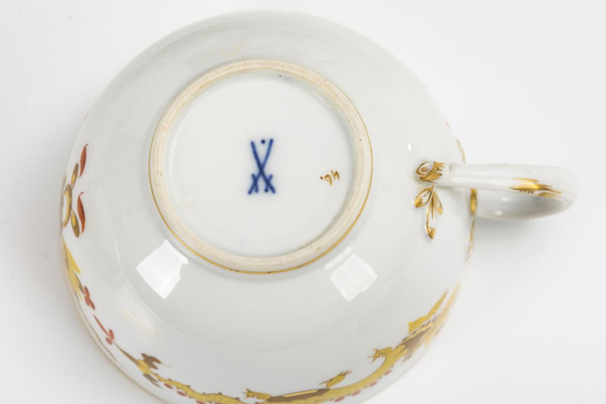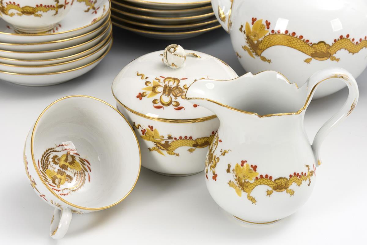 20 parts. Form "new cutout" and smooth form. Teapot (h 14,5 cm), milk jug (h 13 cm), sugar bowl (h 11 cm), 5 tea cups, 6 saucers and 6 breakfast plates. Lid knobs minimally bumped, minimal gold rubbing on the rim of the milk jug.