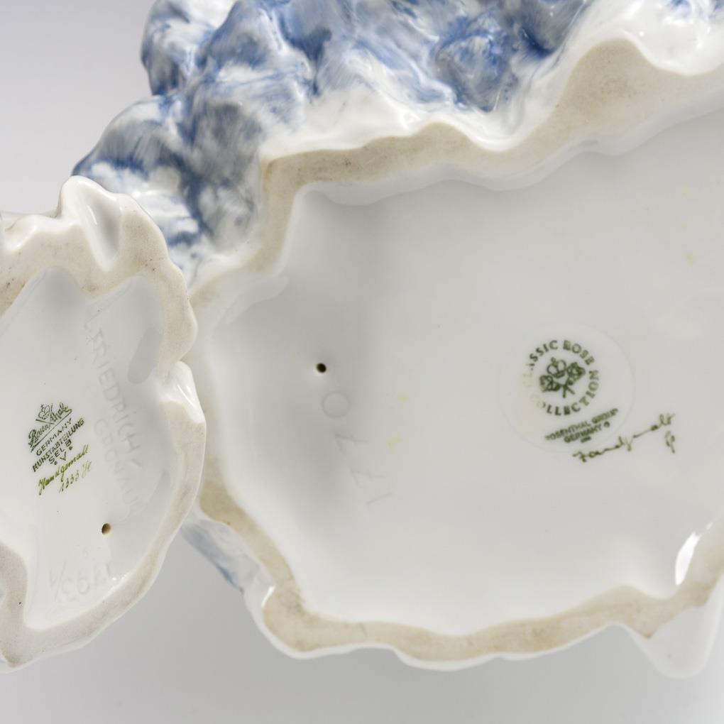 1x model no. 1770, design 1947 by Fritz Heidenreich: kneeling ballerina tying her pointe shoes (h 25,5 cm). / 1x model no. 1793, design 1948 by Lore Friedrich Gronau: princess standing in front of a frog with golden ball (h 20.5 cm). Crown of the frog and the princess restored.