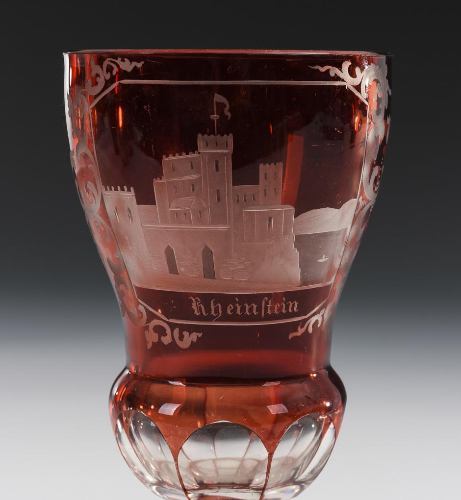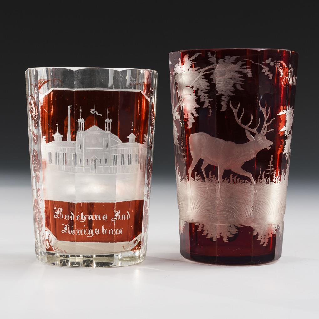 Four, partly faceted handled mugs and 1 goblet. 4x with engraved views (Rheinstein, Königsborn, Bad Rehburg, Ems) and 1x with hunting motif. Bump at the foot of the goblet glass.