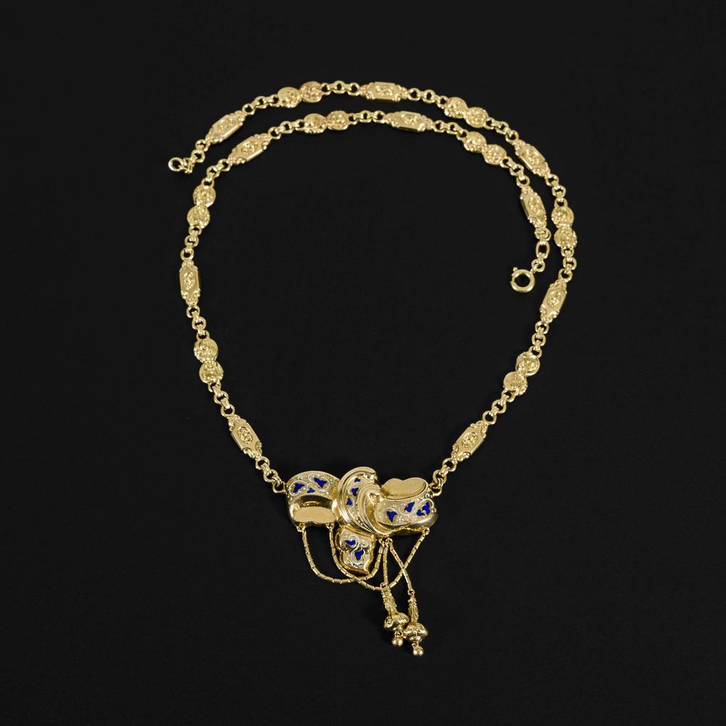 Relief center ornament partially enameled blue and white with chain and pampel suspensions, between relief link chain, on ring spring clasp. Backs closed. Scattered small cracks on relief edges.