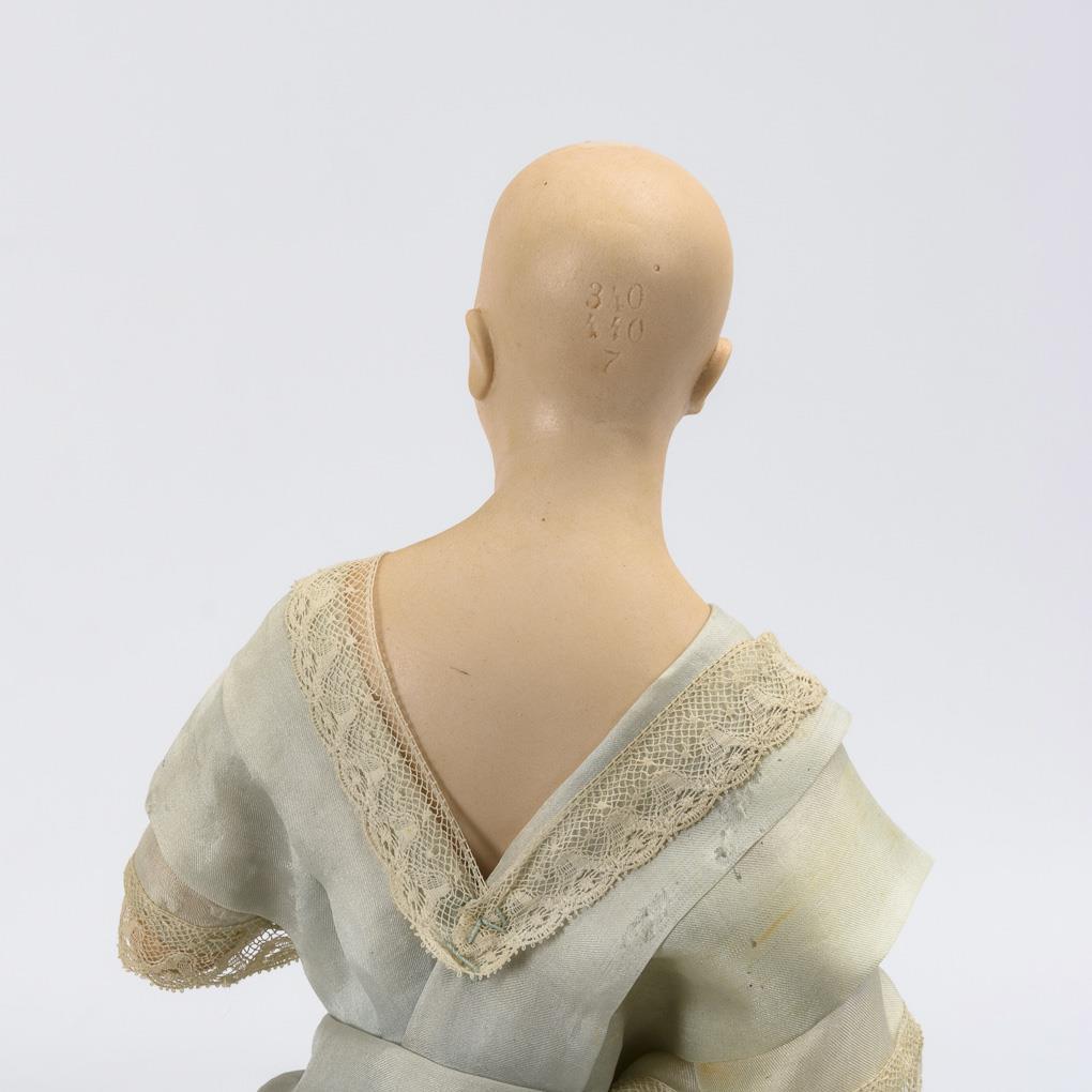 Tea doll bust made of bisque porcelain, blond mohair wig, original light blue silk dress on wide base. No defects visible.