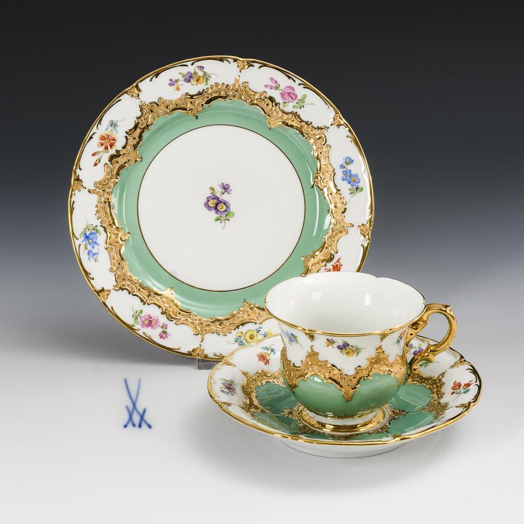 Green partial background, polychrome scattered floral painting, partly bronzed gold staffage. H cup 7.5 cm, Ø saucer 16.5 cm, Ø breakfast plate 19.5 cm.