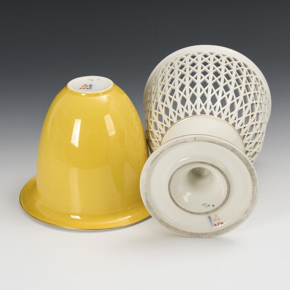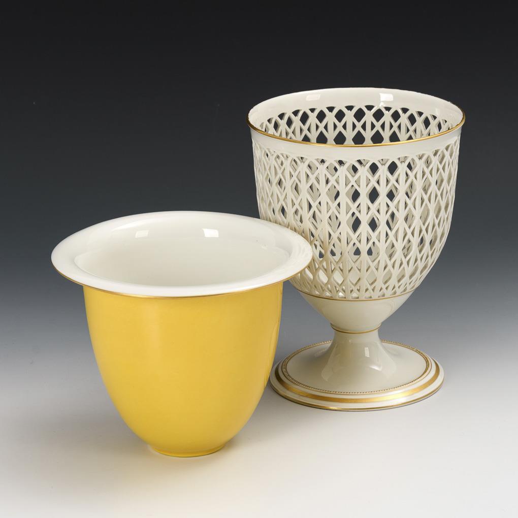 Bell-shaped, lattice-like pierced dome with short shaft and round base and correspondingly designed insert with cantilevered mouth rim. Minimal gold abrasion on the rim of the basket.