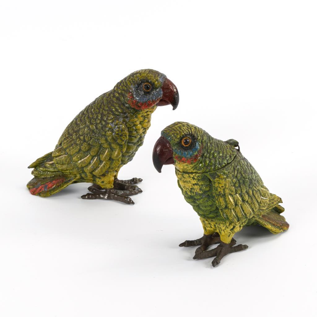 Gleichartige Papageien, 1x aufklappbar als Tintenbehälter mit Porzellan-Napf innen.