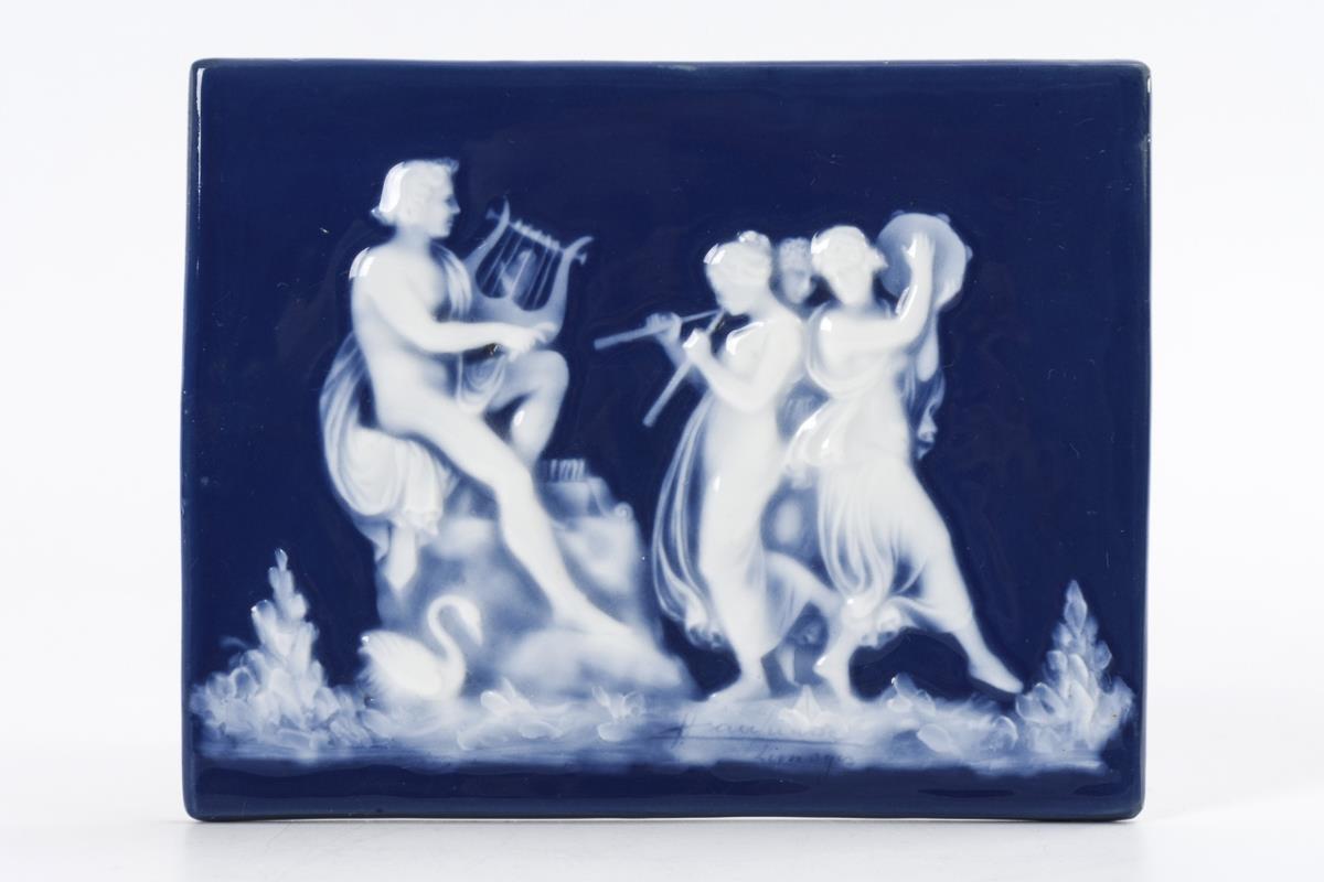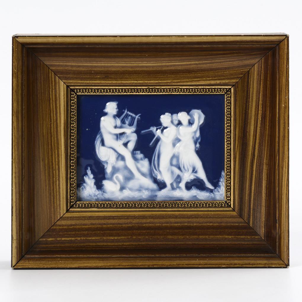 Rectangular plate with the representation executed in fine slip painting of Apollo sitting on a rock with lyre and three dancing and playing music maenads.