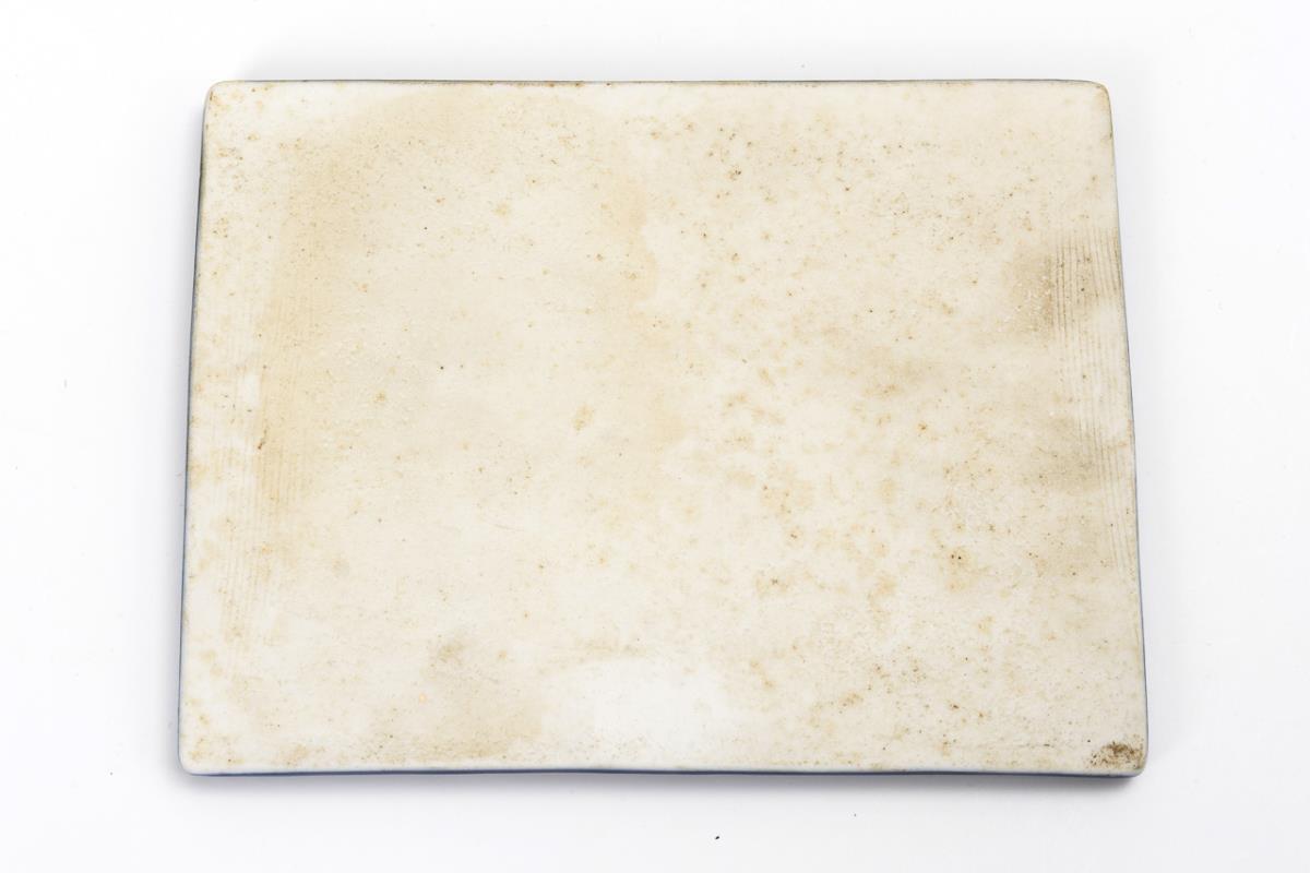Underglaze blue background, white slip painting. 12 x 15 cm, in wooden frame (21.5 x 25 cm).