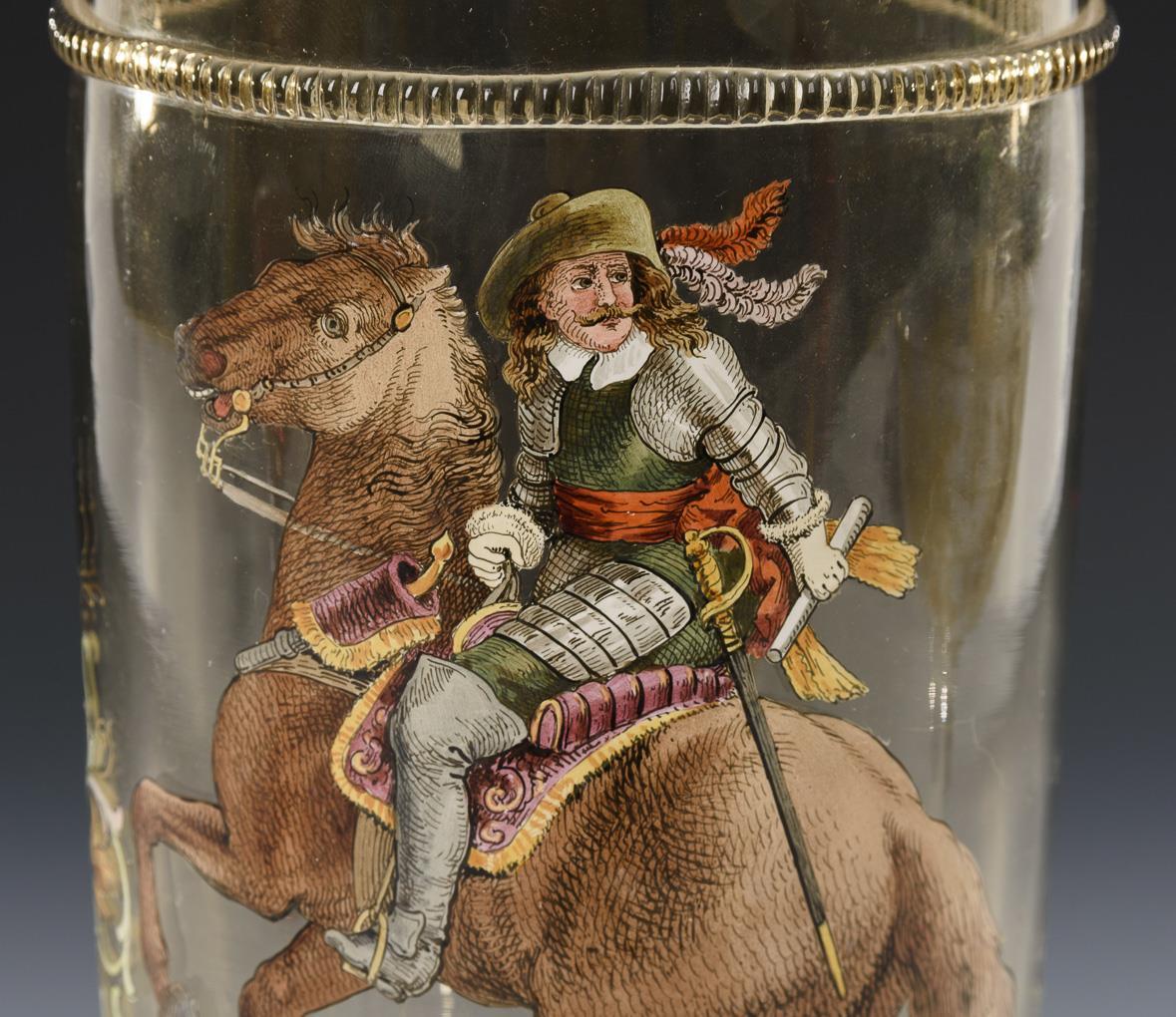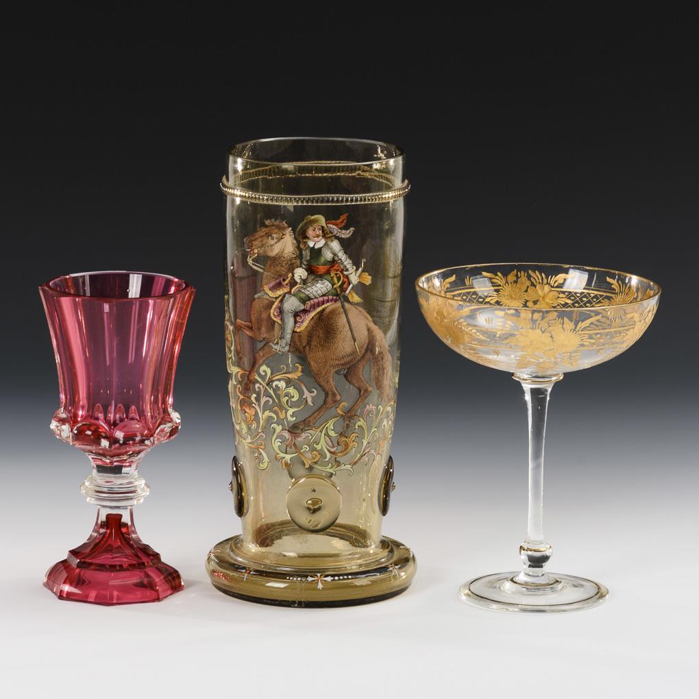 1x faceted Biedermeier goblet made of colorless glass with pink inner catch (h 18.5 cm). / 1x Historism goblet made of olive brown glass with polychrome enamel painted depiction of a horseman (h 27 cm). / 1x footed bowl of colorless glass with gold-staffed floral engraving (h 19 cm). Partial minimal gold abrasion, 2 minimal bumps on the goblet glass.