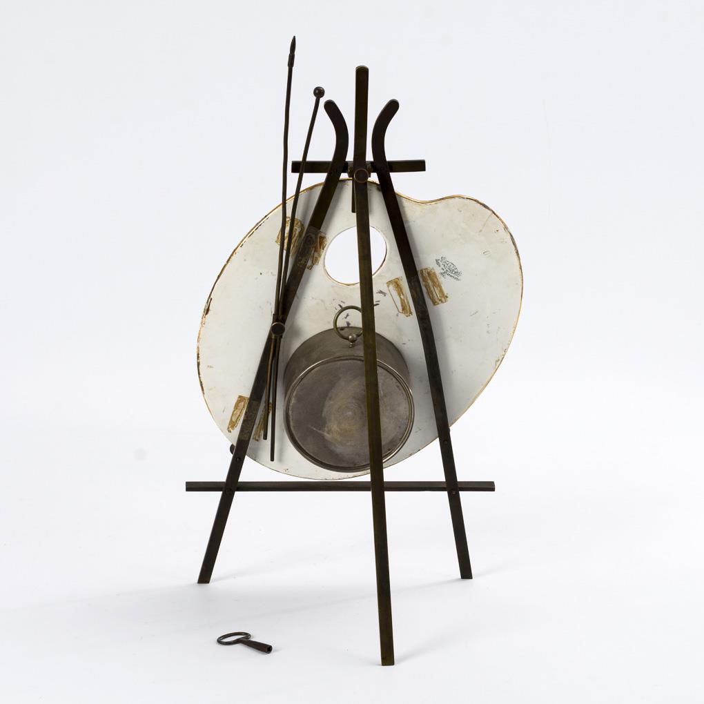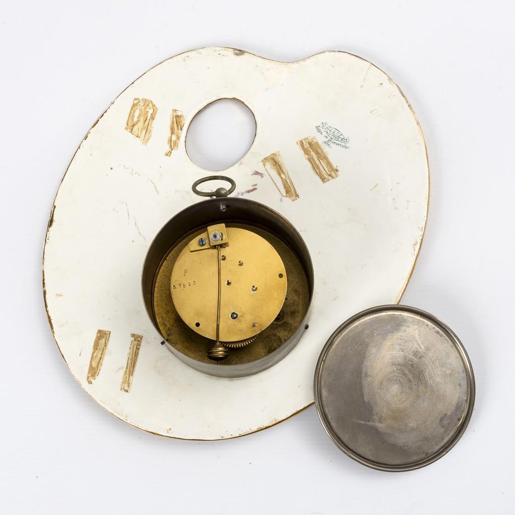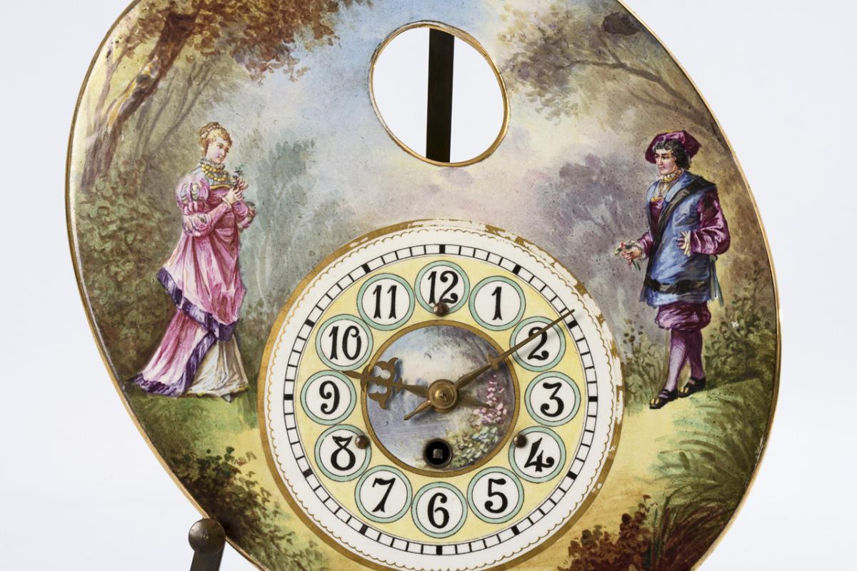Case with a historicizing motif of a pair of lovers in landscape. With separate eyelet suspension. Clock stand in the form of an easel with painting utensils. With 1 key. Glued edge chip, rubbing.