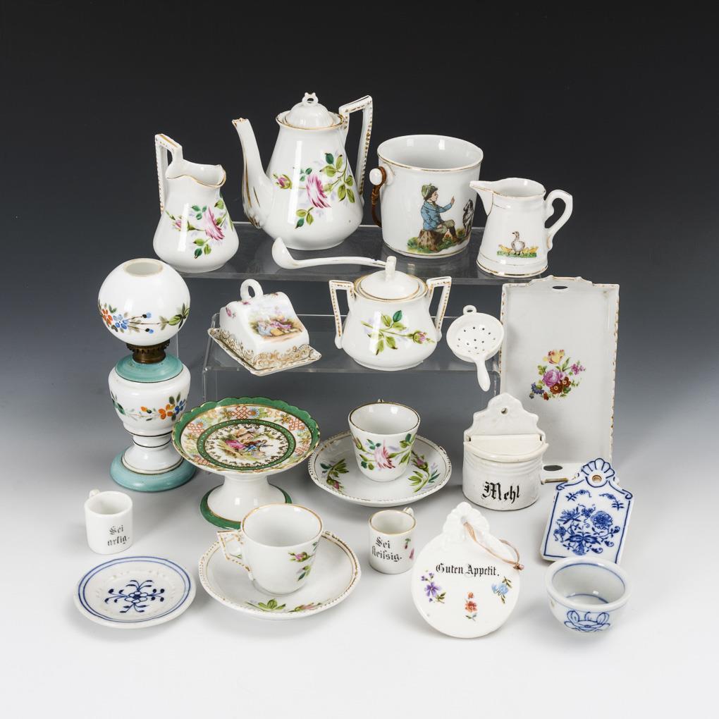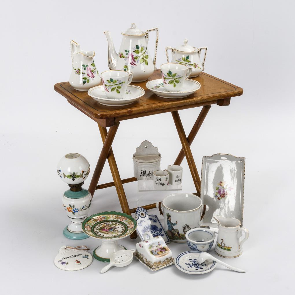 Folding table made of solid beech wood, marked on the bottom "Naether" (27.5 x 32 x 22.5 cm). In addition, about 19 different pieces of beautiful porcelain, including bucket, centerpiece, tête-à-tête, cups, wall container "flour" etc., as well as a table lamp made of painted milk glass. Small bumps, gold partly rubbed.