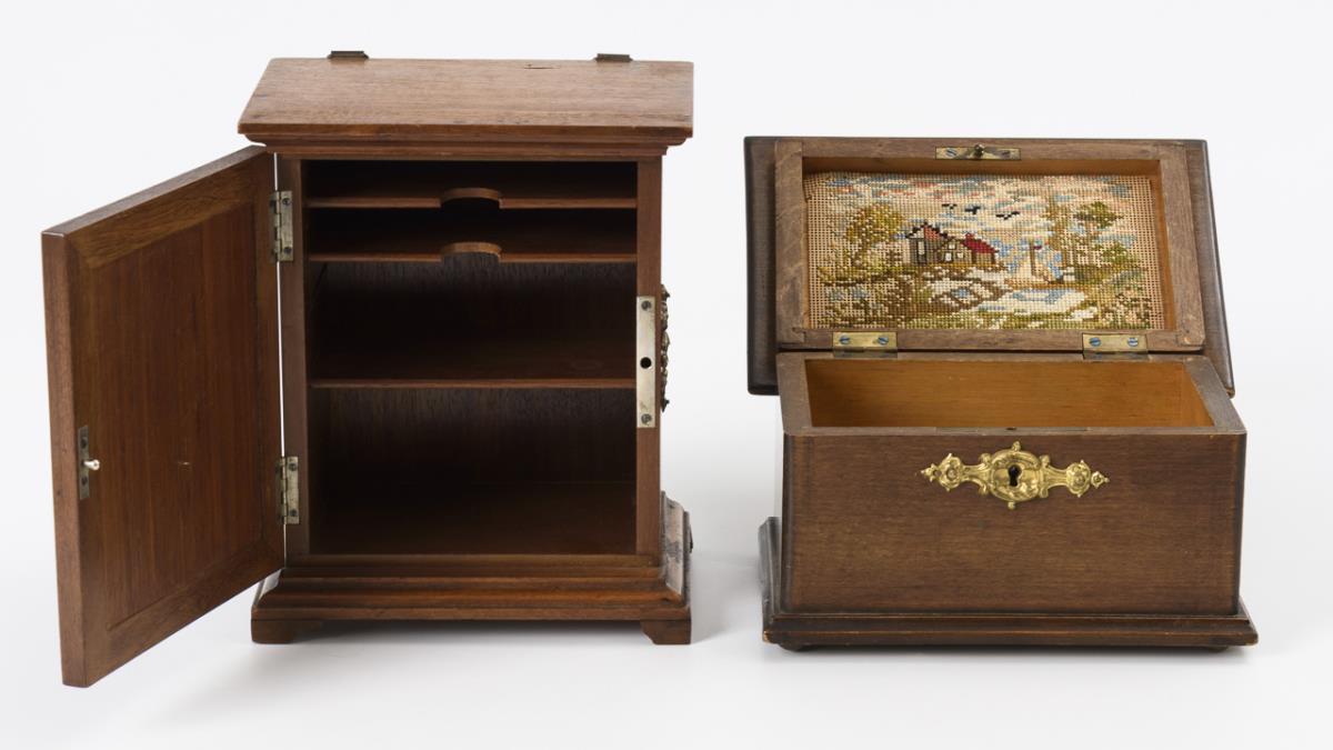 Cabinet-shaped casket with silver-plated decorative fittings on the front door (2 empty cartouches with flower basket in the center); compartments inside. / Chest-shaped box with baroque fittings on the hinged lid; in the lid embroidery (village landscape). Minimal signs of age/use, chest minimal anobia traces.