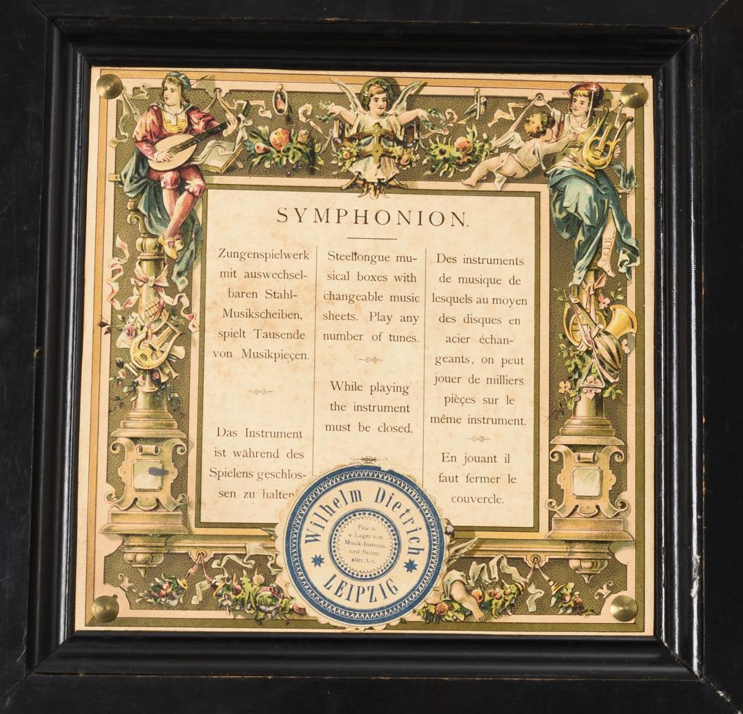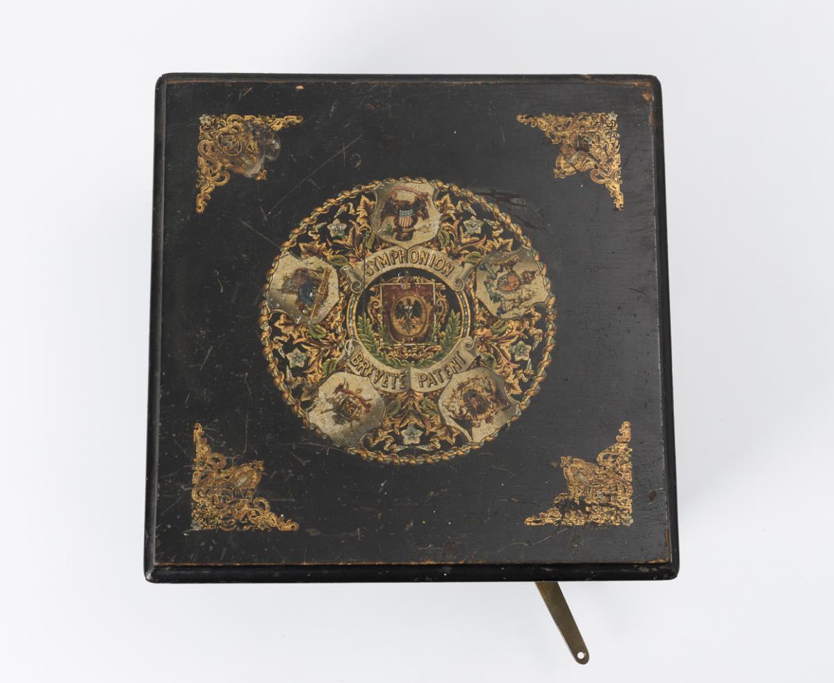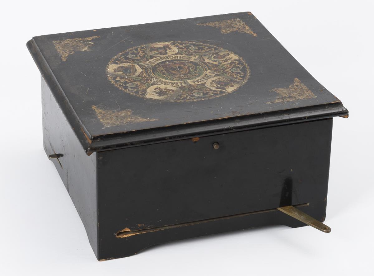 "Music box" with magnificent company logo on the lid and ratchet winding in the front. In the lid color lithograph with explanation in 3 languages. Movement with 2 rollers and 2 combs (combs 11 cm) over cast iron base plate. Plays with side noises. Box in need of restoration.