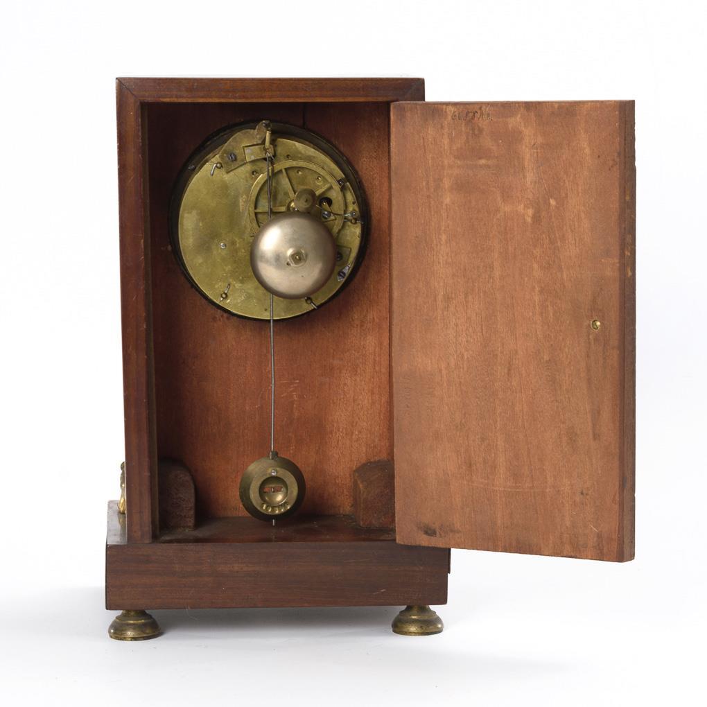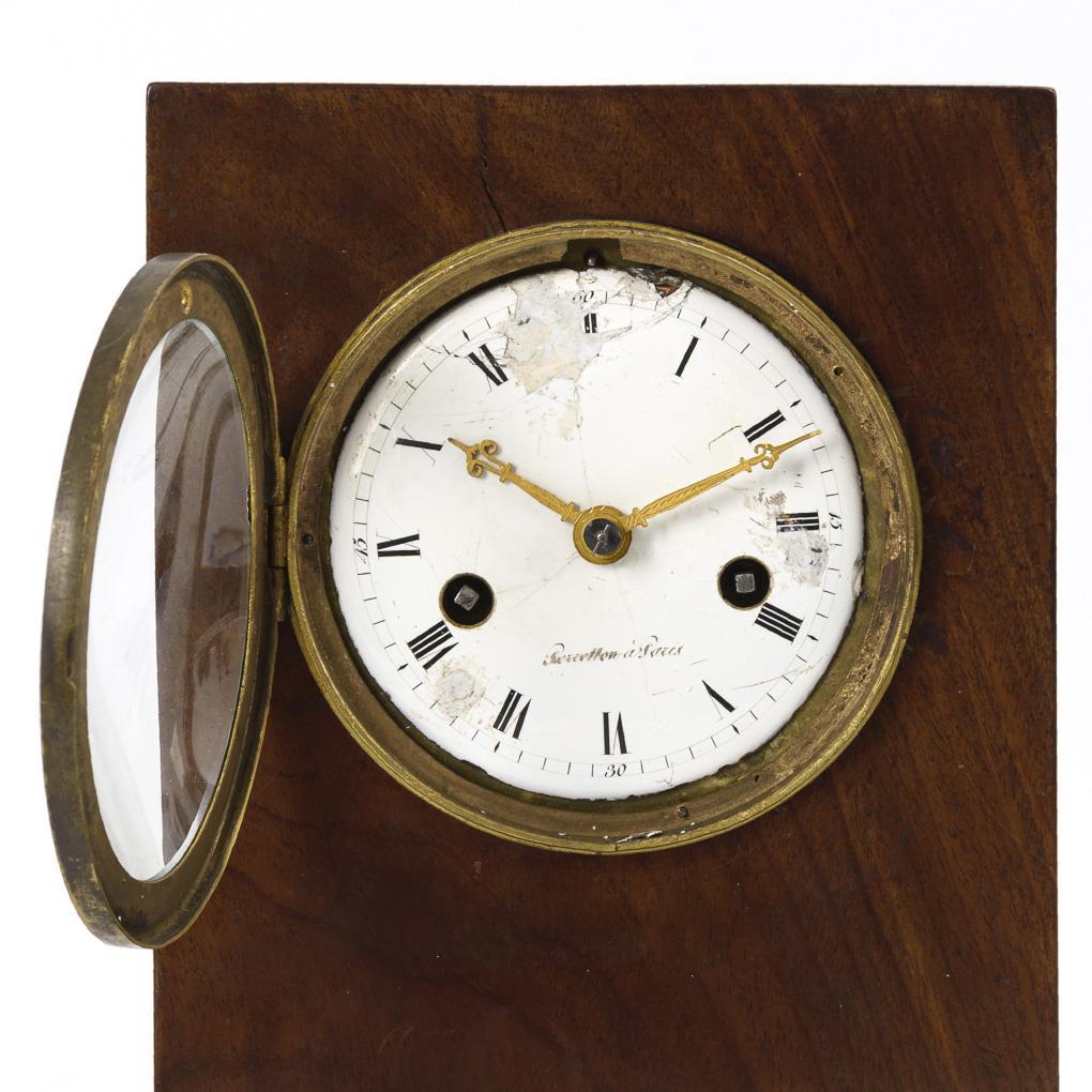 Unmarket movement with half-hour strike on bell, running. Arched glazed white enamel dial marked "Perretton à Paris", Roman numerals, minute ring and complemented hands.