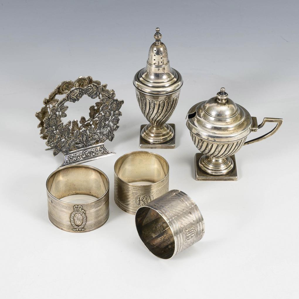 Relief napkin holder, mustard pot with blue glass insert, salt shaker and 3 monogrammed napkin rings. Light signs of use.