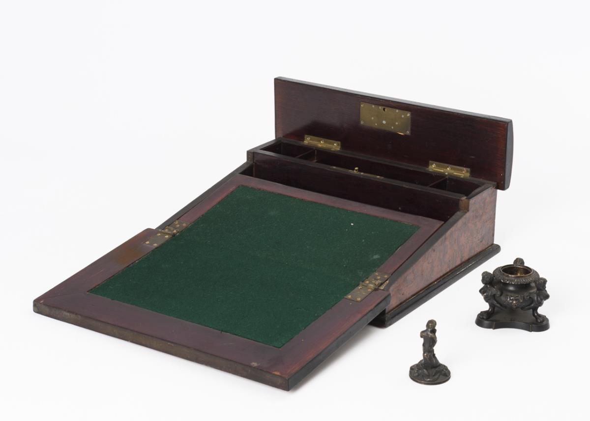 Travel writing box and bronze inkwell.