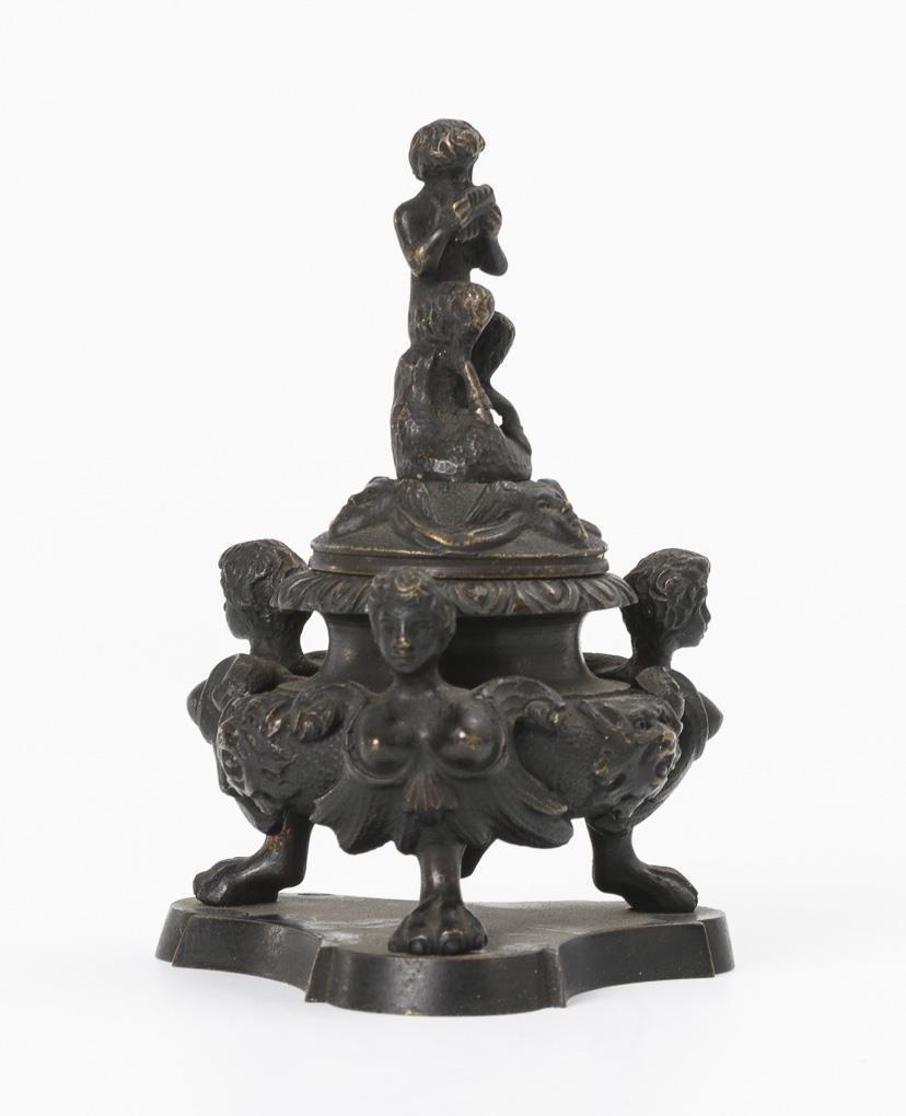 Oblique desk box with ornamental inlay; oblique writing surface inside covered with green felt, various compartments. / Renaissance-style inkwell with siren monopodia and leaf masks, and lid with hermen masks and fully plastic figure of a faun. Veneer flaws, missing compartment walls.