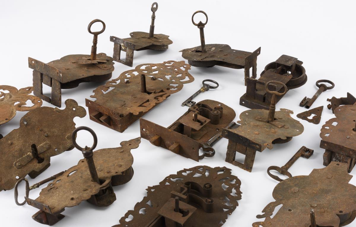 7 door locks partly with double latches, 6 pincer locks ("cat heads"). Most of them with a ring light. In addition, 1 key with alignment disc in star shape. Strong signs of age / use. 2 keys supplemented, 1 repaired.