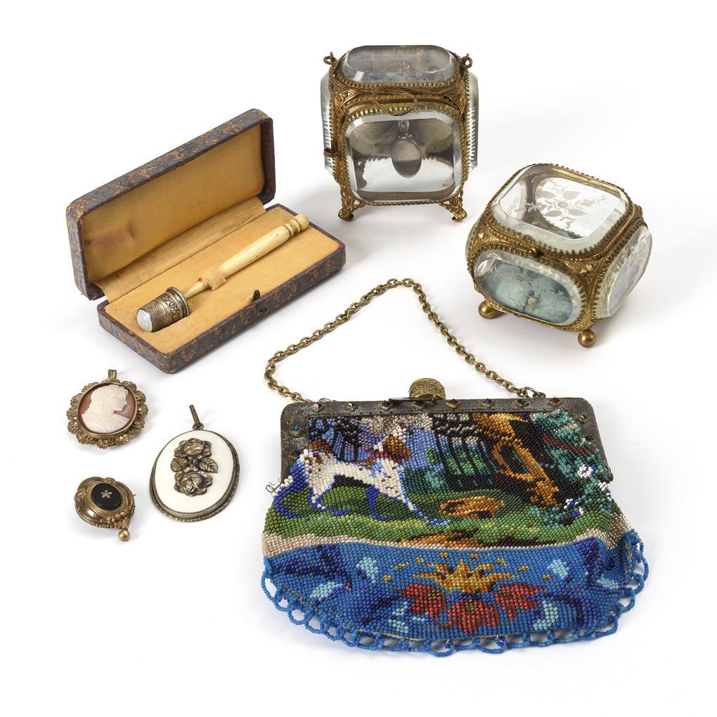 Pearl bag on both sides with dog motif; metal bail with glass stones and pusher and chain. / In marbled cardboard case thimble of silver (tested) with leg awl. / Reliefed brass display cases faceted glazed on all sides, 1x vegetal cut pattern on all sides; velvet inside. / 1 Biedermeier brooch, 1 agate cameo with woman's head, 1 silver pendant with roses on white glass, 1 miniature metal. Small holes on the case, velvet in the display cases partly worn, partly minor signs of age/use.