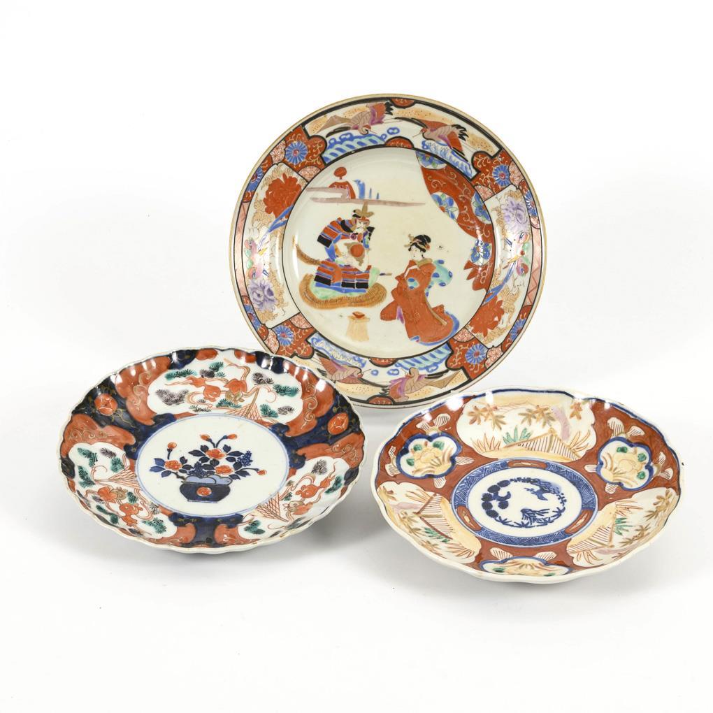3 Imari plates, one of them with person.