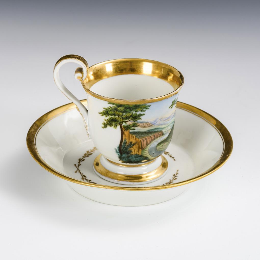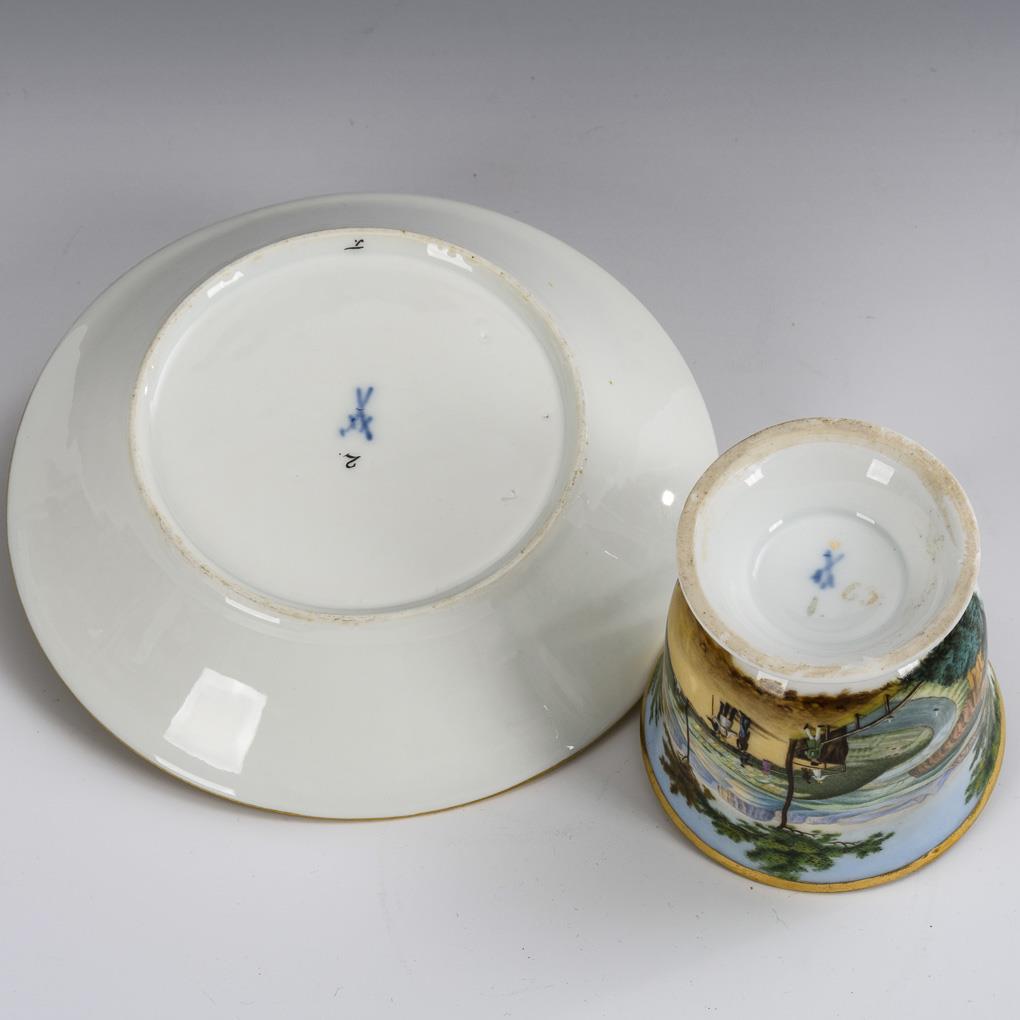 Polychrome painted, gold decorated. H cup 9 cm, Ø saucer 15.5 cm.