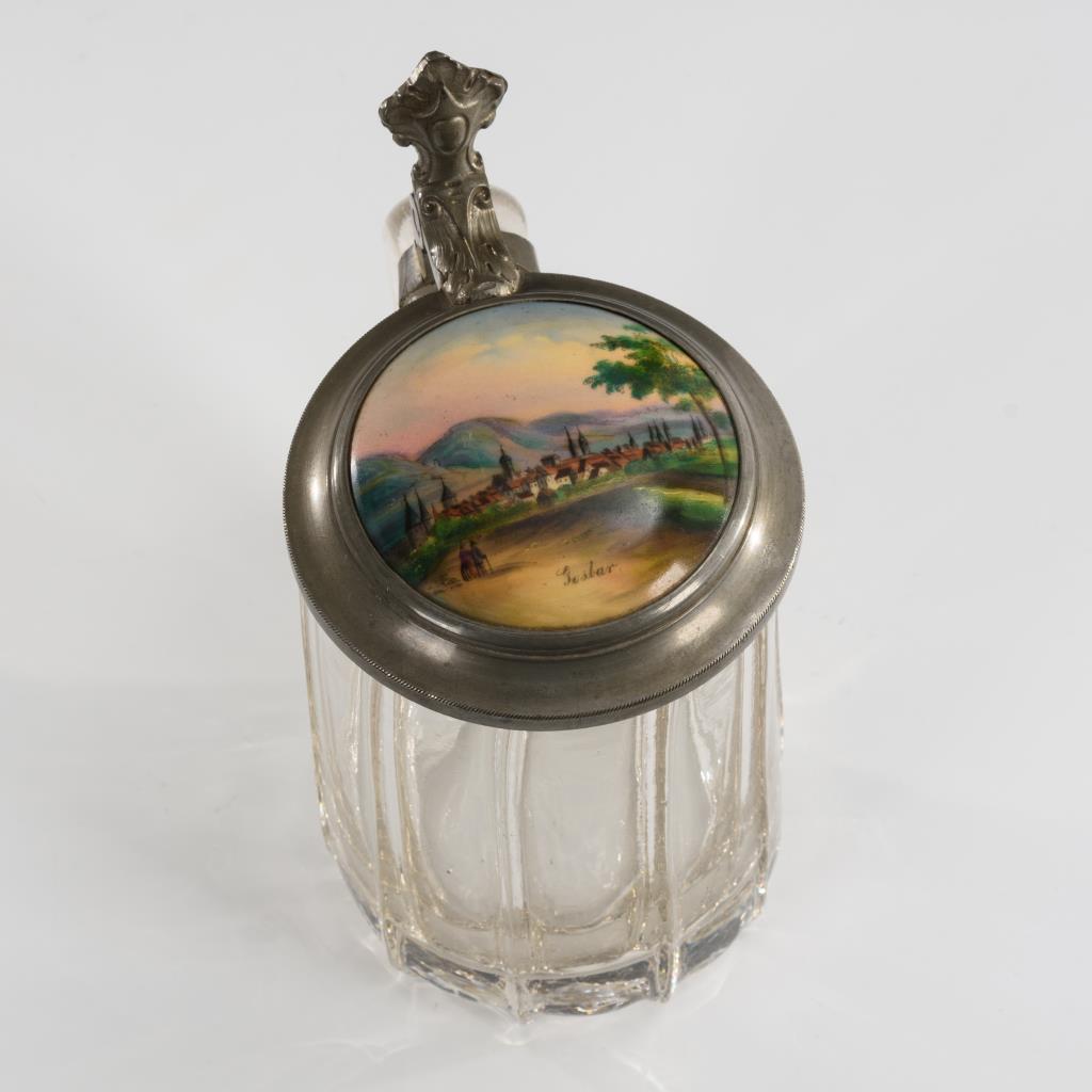 Pseudofacettierter Bierkrug mit zinnmontiertem Deckel mit über Vordruck farbig gemalter Porzellanplakette. / Konischer Bierkrug mit zinnmontiertem Deckel und geschliffenen Ansichten. / Konischer Becher mit schauseitiger Ansicht.