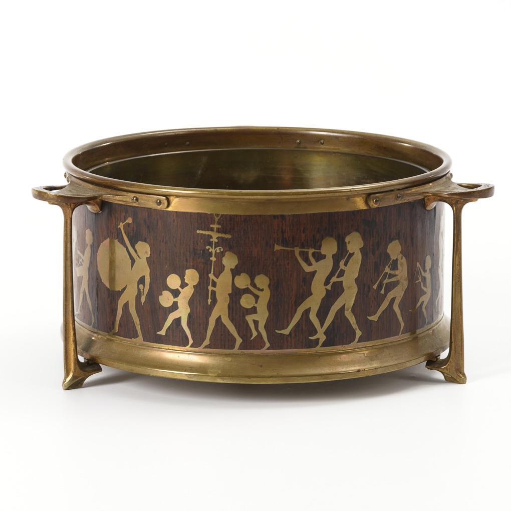 Copper and brass, rosewood with figural brass inlays, clear glass. H 12,5 cm, Ø 23,5 cm (without supports). 2.5 kg.