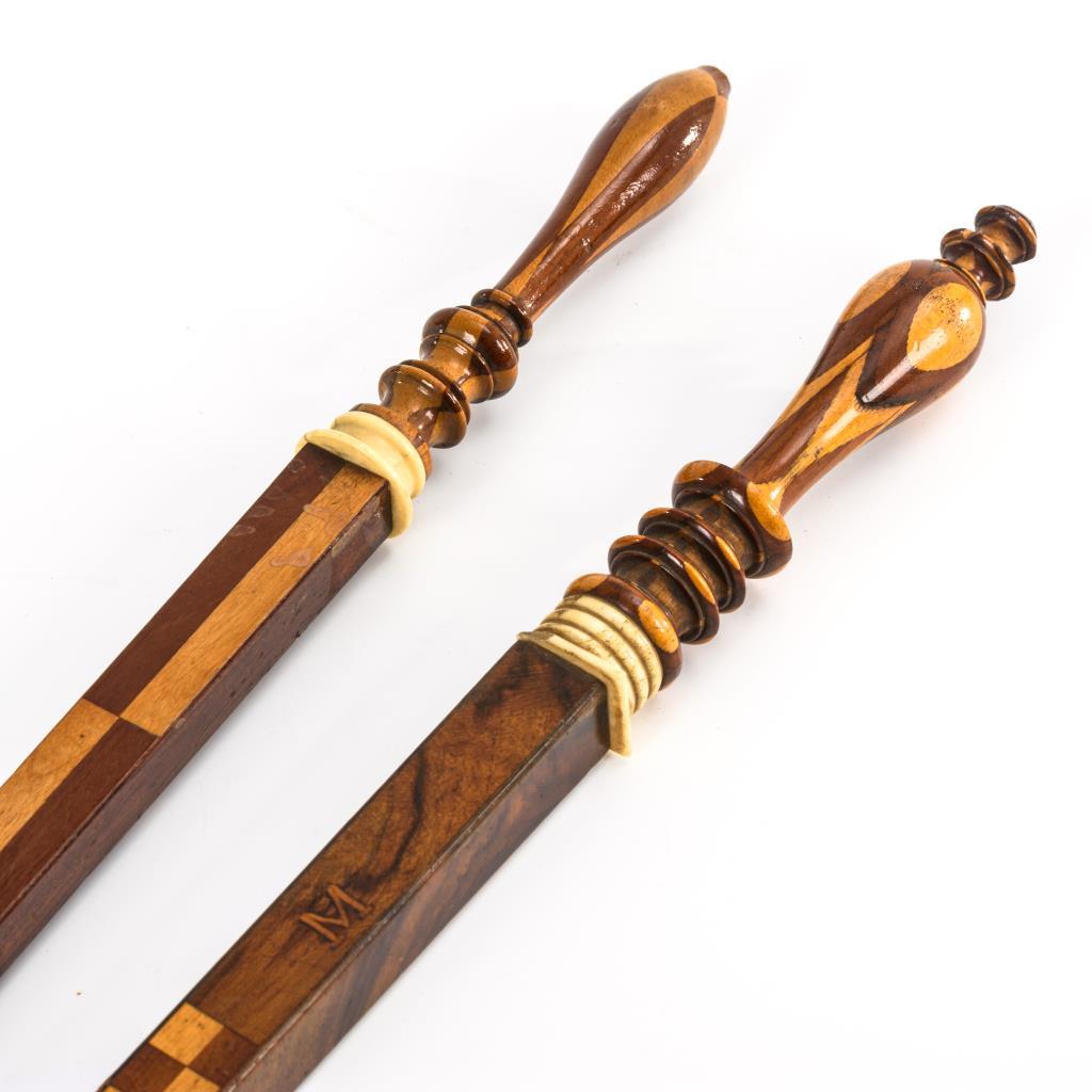 1x mit marketiertem "M" bezeichnete Ellen mit kontrastreichem Furnierbild. Alters-/Gebrauchsspuren mit kleineren Fehlstellen.