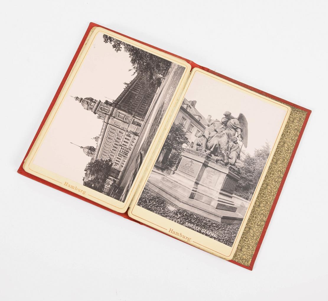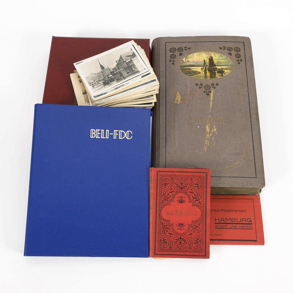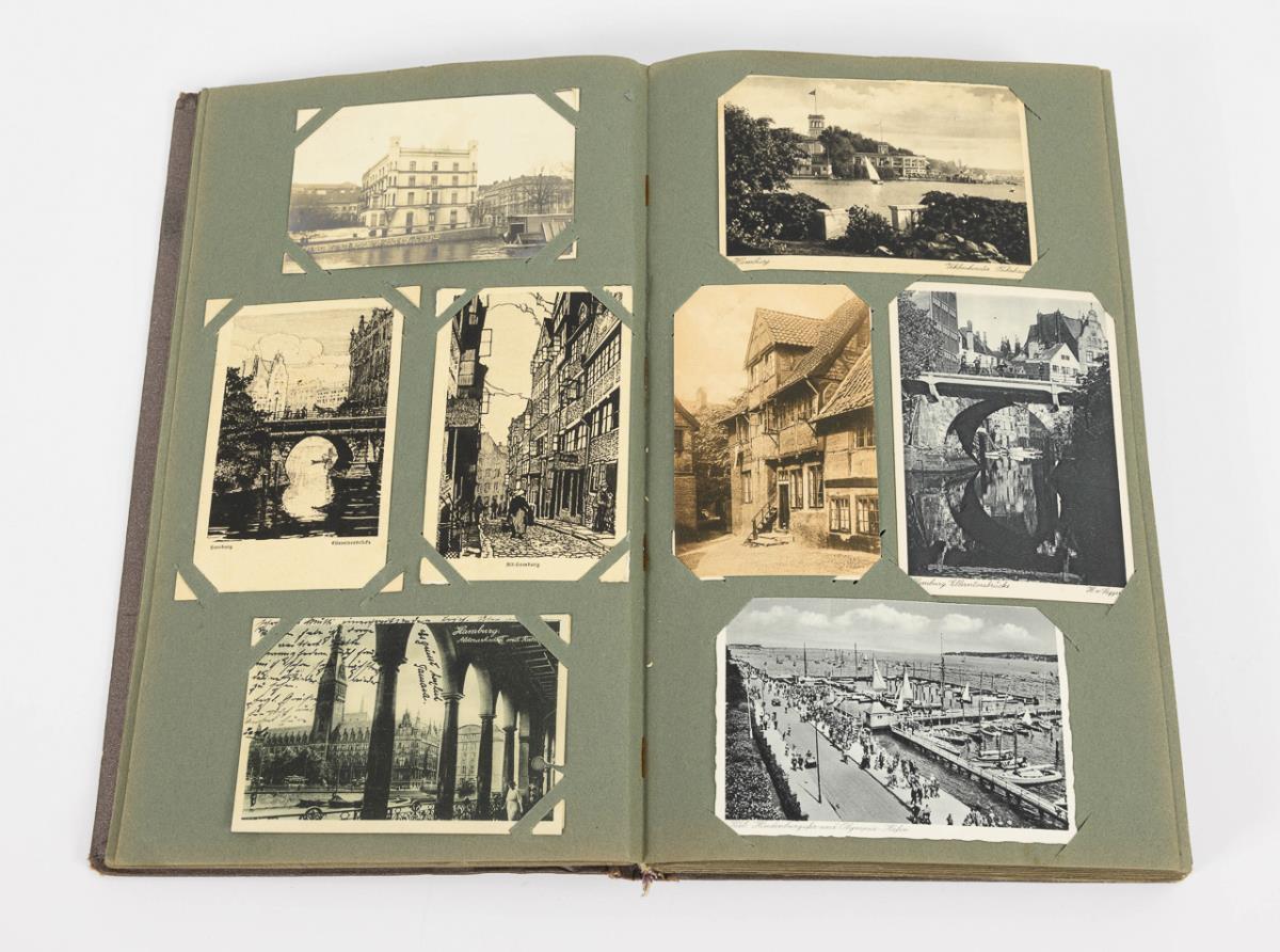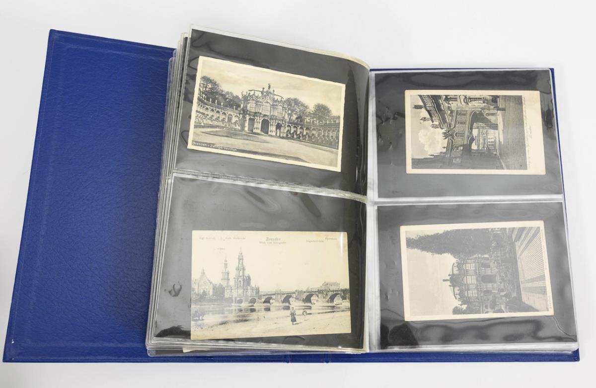 Album with about 350 Hamburg - views, including litographies. Also photo leporello and similar views, some cards loose, before 1945. Dark album with sailboats in oval image section, 39 x 24 cm. / Approx. 49 picture postcards of Dresden, mostly pre-1930, in modern blue album 30 x 24 cm. / Approx. 152 picture postcards of Mecklenburg-Western Pomerania, Saxony-Anhalt and Brandenburg, probably mostly before 1950, in modern red album with slipcase, 30 x 23 cm.