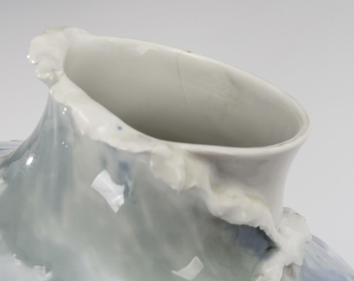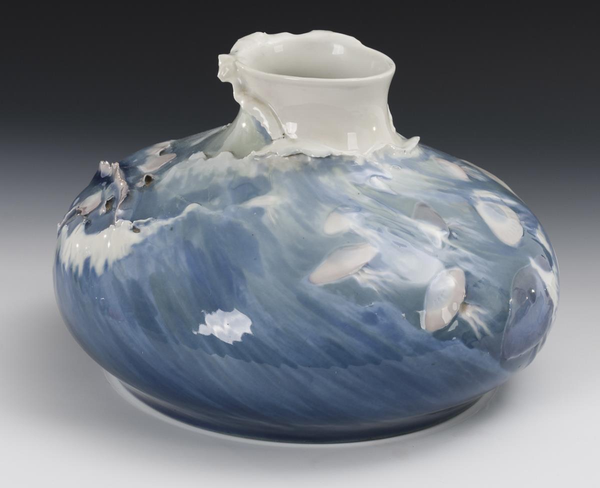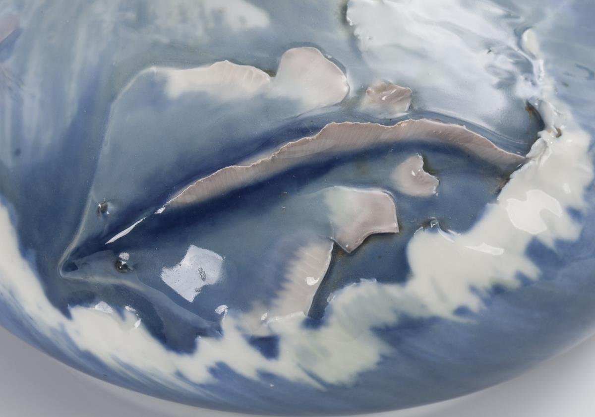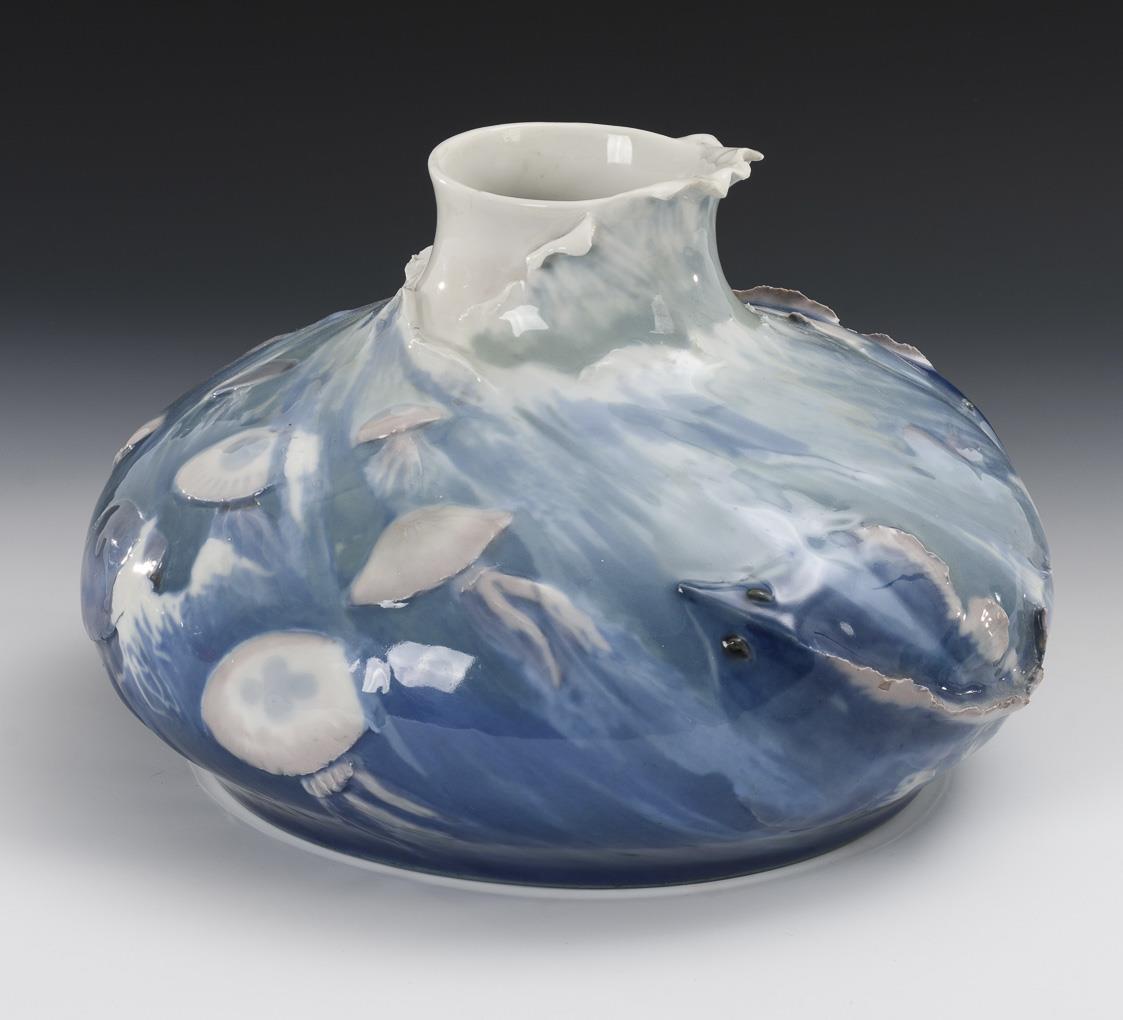 Depressed bulbous body with a surrounding seascape in relief with waves, jellyfish and rays. Hairline crack at the mouth edge, partial bumps on the relief edges.