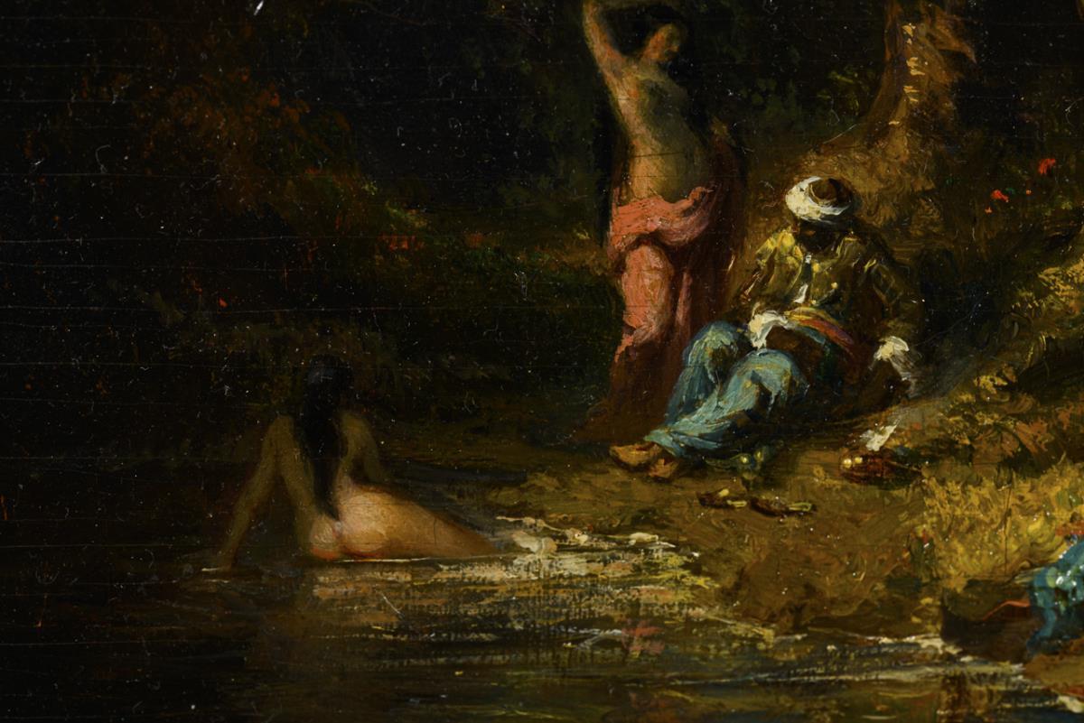 Resting on the shore under the trees with the naked women in the water. Traces of age.