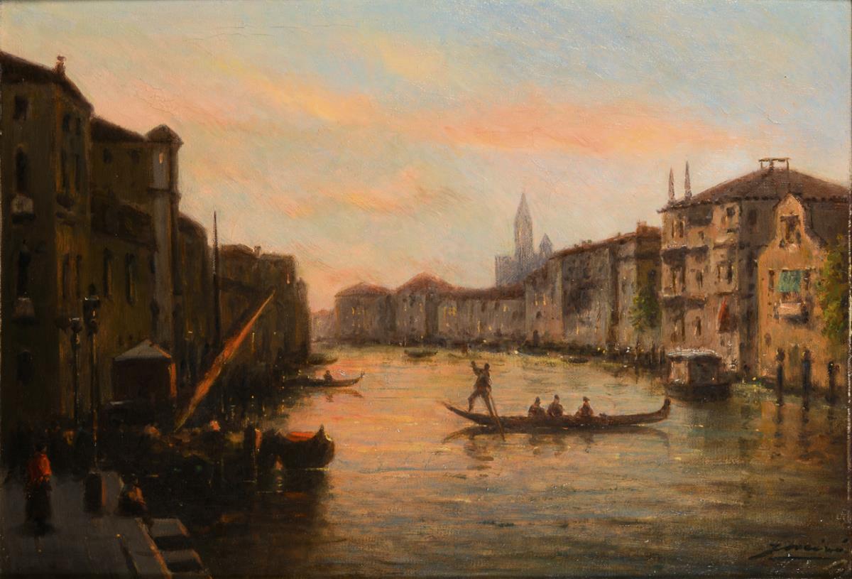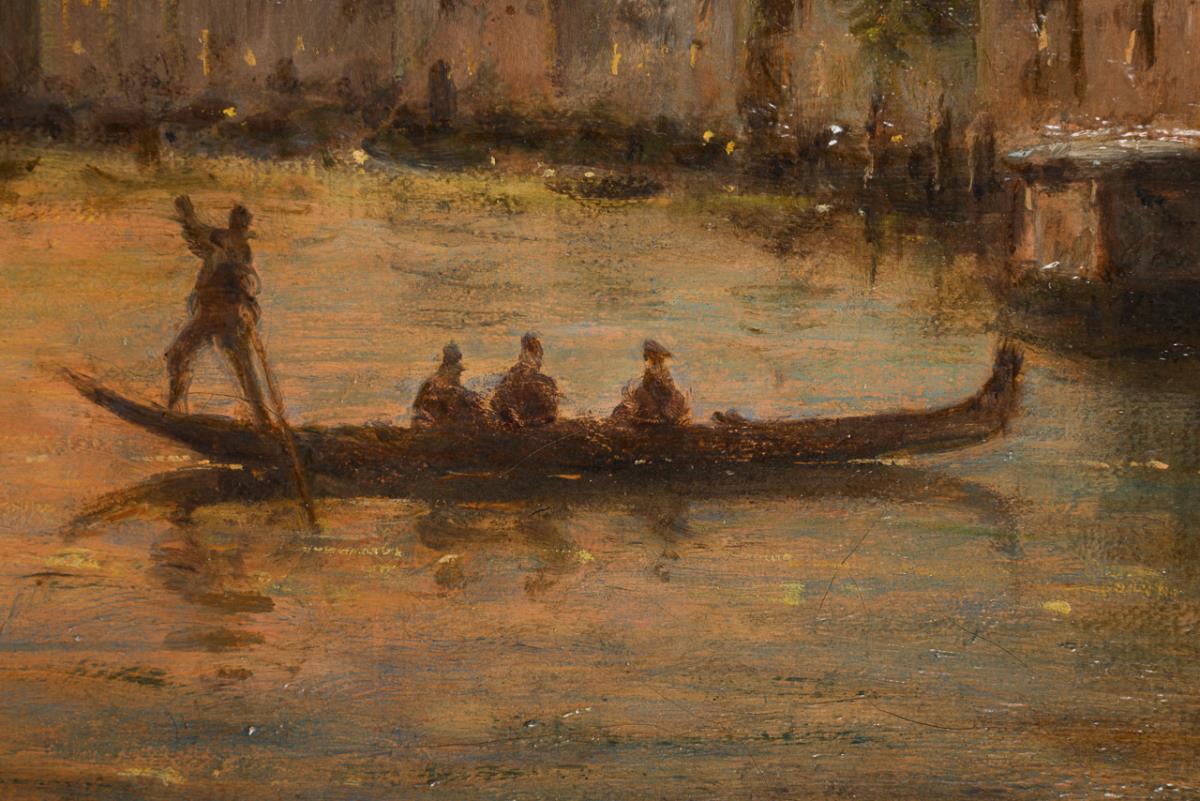 Gondoliers on the water with the setting sun at the end of the canal. Retouched in the sky.