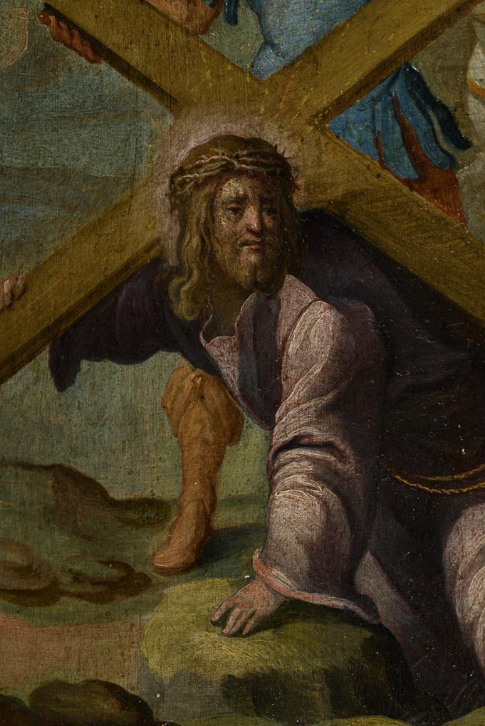 The Messiah with the cross on his shoulders on the way to Mount Golgotha. Behind him the driving executioners and crowds. Slight signs of age.