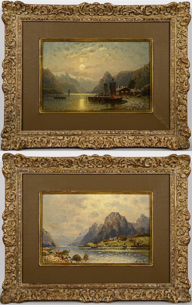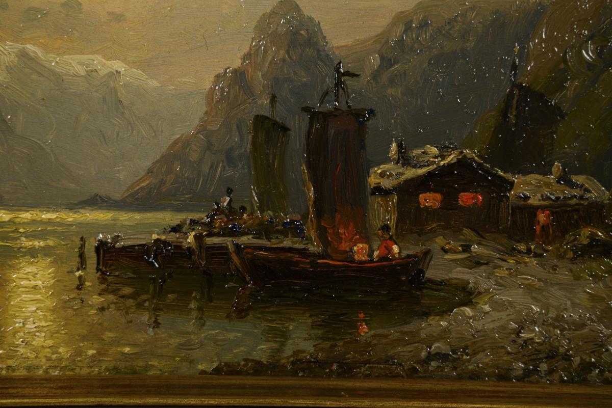 Each depicting a fjord with boats and steamers as well as a village near the shore by day or at full moon.