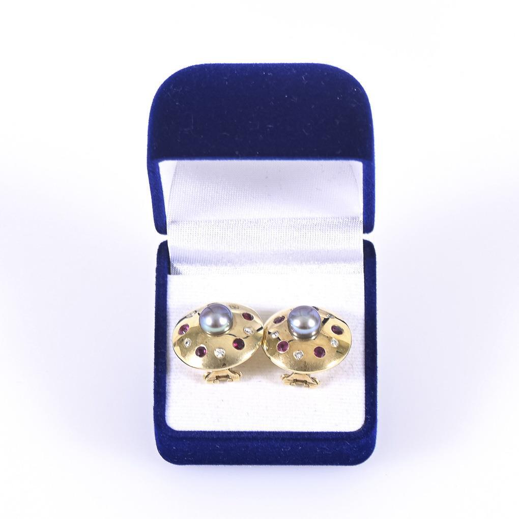 Pair of stud earrings with cultured pearls, diamonds and rubies.