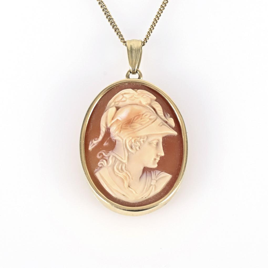 Cameo with antique cut motif of the goddess Minerva with dragon crowned helmet, in closed frame setting, on delicate curb chain with ring spring clasp.