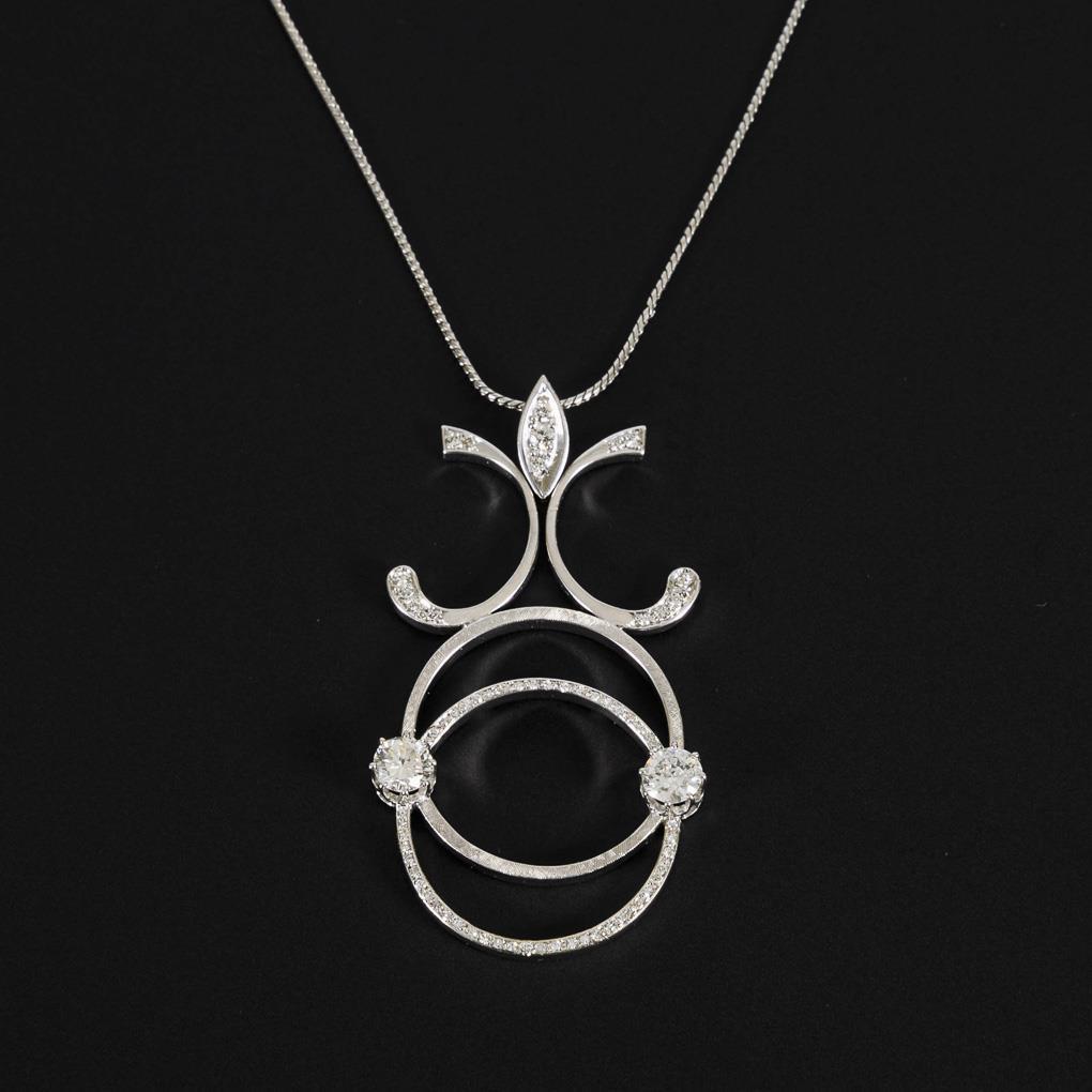 White gold pendant 585 stamped. White gold chain 750 stamped. Brilliant 1x approx 0.75 ct, 1 x 0.8, ct. 5 diamonds and about 60 diamonds total approx 0.75 ct. Pendant 6,5 x 3,5 cm. Chain L 58 cm. 17,9 g.