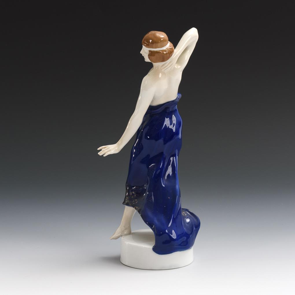 On a round base in a dancing pose standing young woman with blue skirt and bare torso.