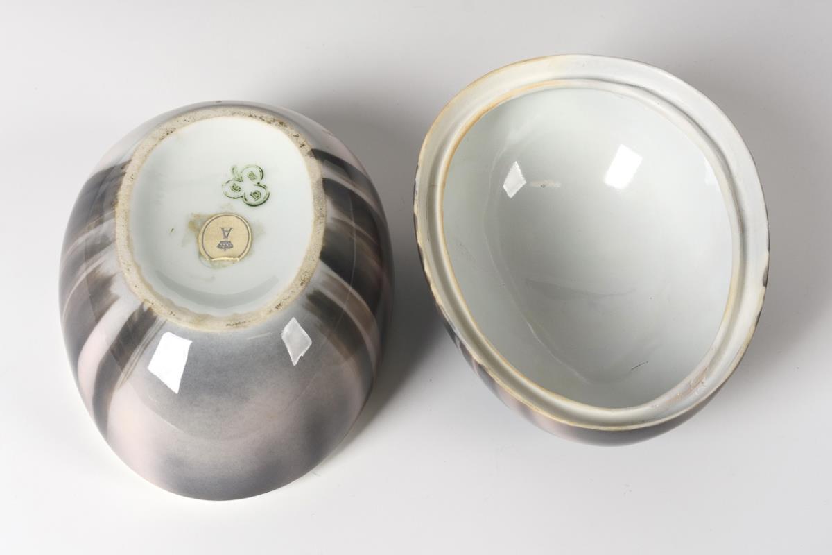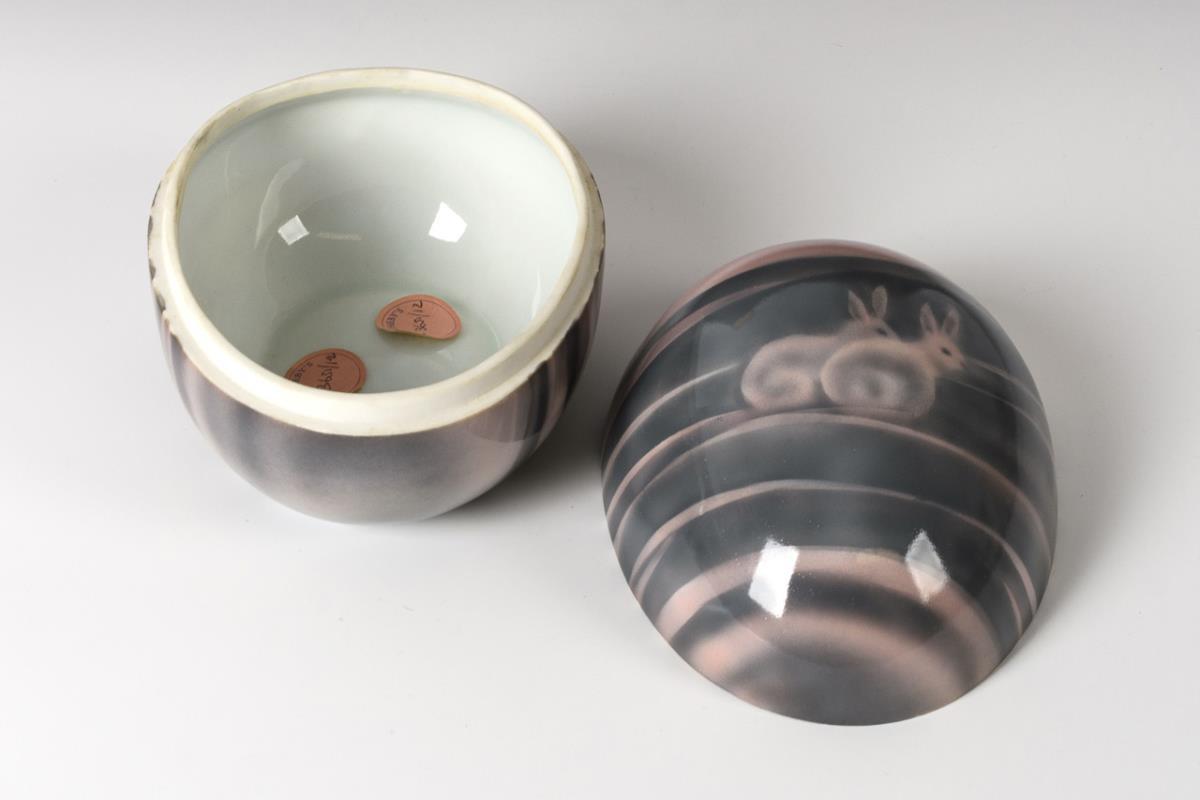 Egg box with the underglaze decoration of two rabbits in a landscape. Can lid restored.