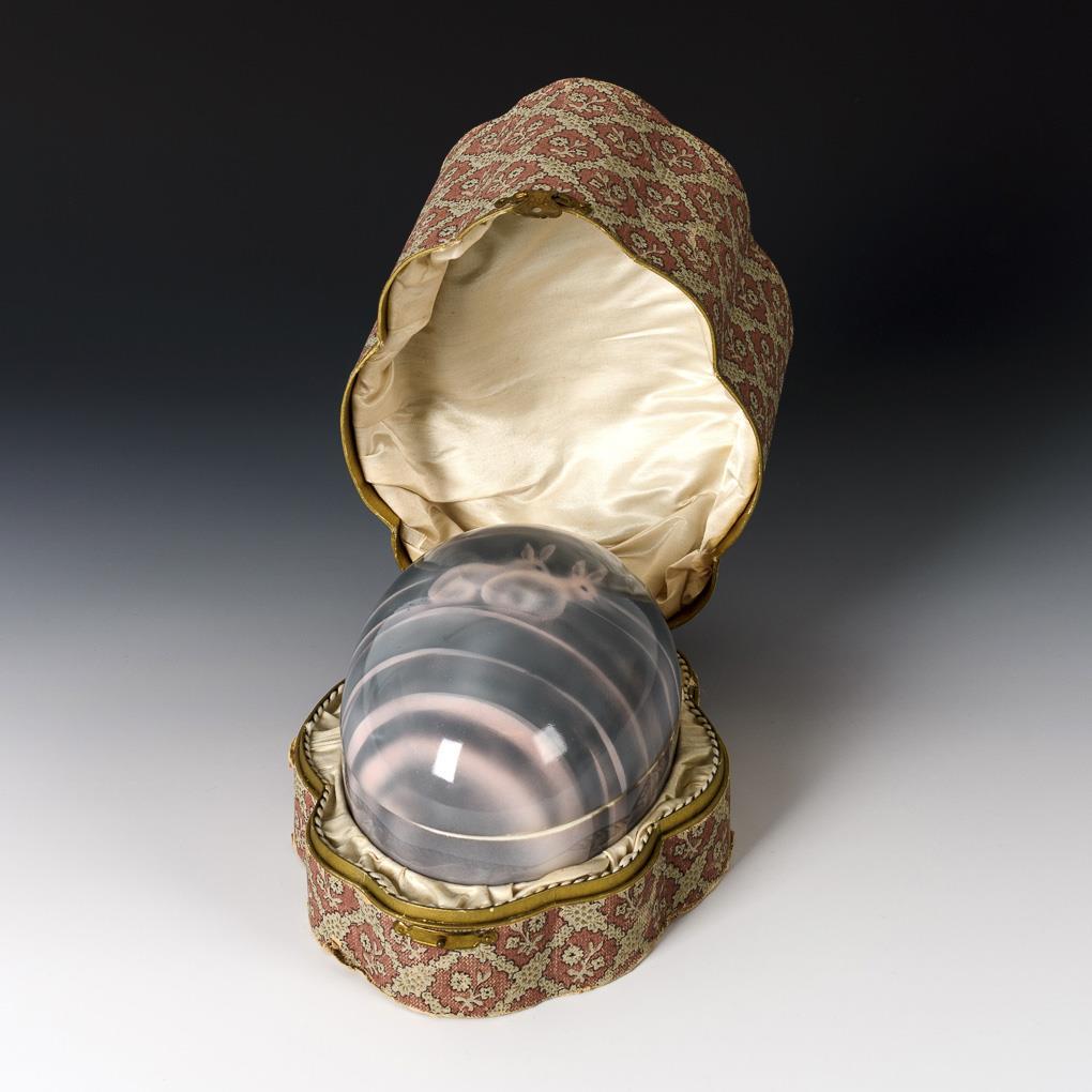 Underglaze decoration in pink and gray. L 16,5 cm, in original box (h 15,5cm).