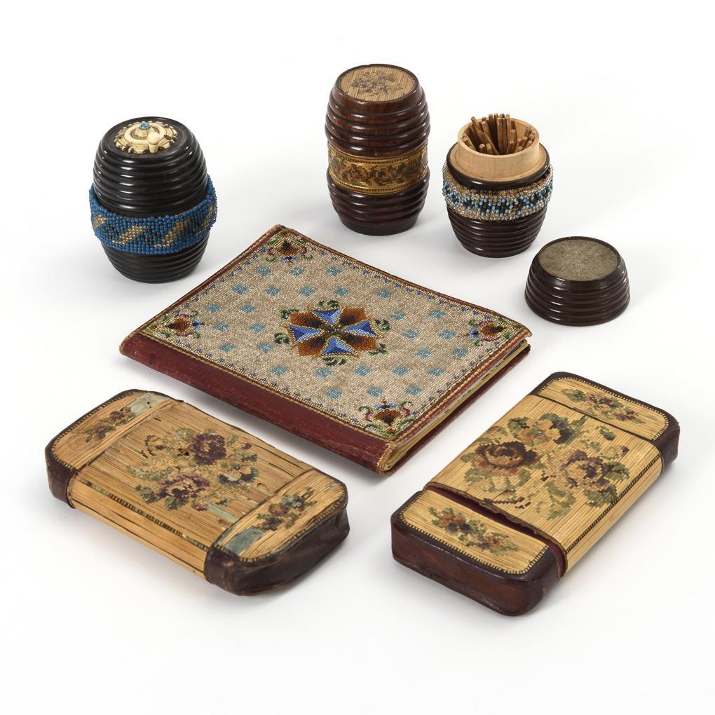 3 turned match barrels with ornamental appliques, 2 cigar cases with "straw inlays": floral bouquet and monogram "AR" and flowers and soldier with monogram "KH" respectively. Book portfolio on both sides with ornamental bead embroidery; inside an empty book and 1 apprenticeship contract(?) of 1821 with Prussian watermark (FWR) and postmark "4 Gut.Gr.". Partly strong signs of age / use and missing.