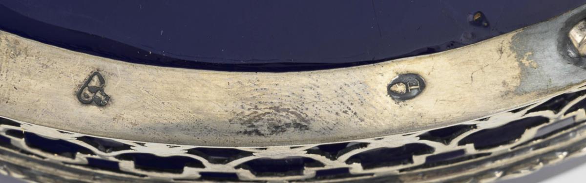 Oval silver holder with serpentine handles and lion feet, lid with leaf relief. Blue glass insert probably original. Glass insert with several small chips, knob loose.
