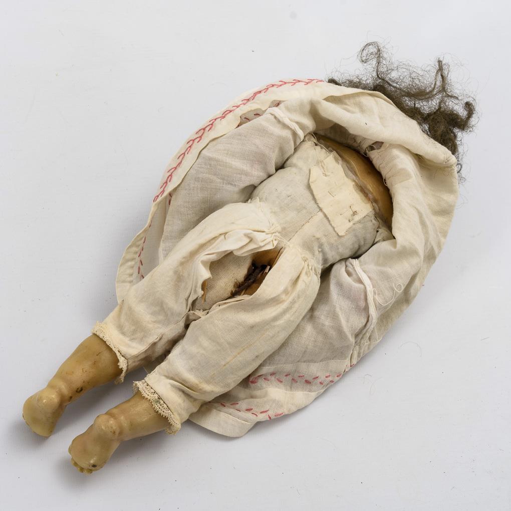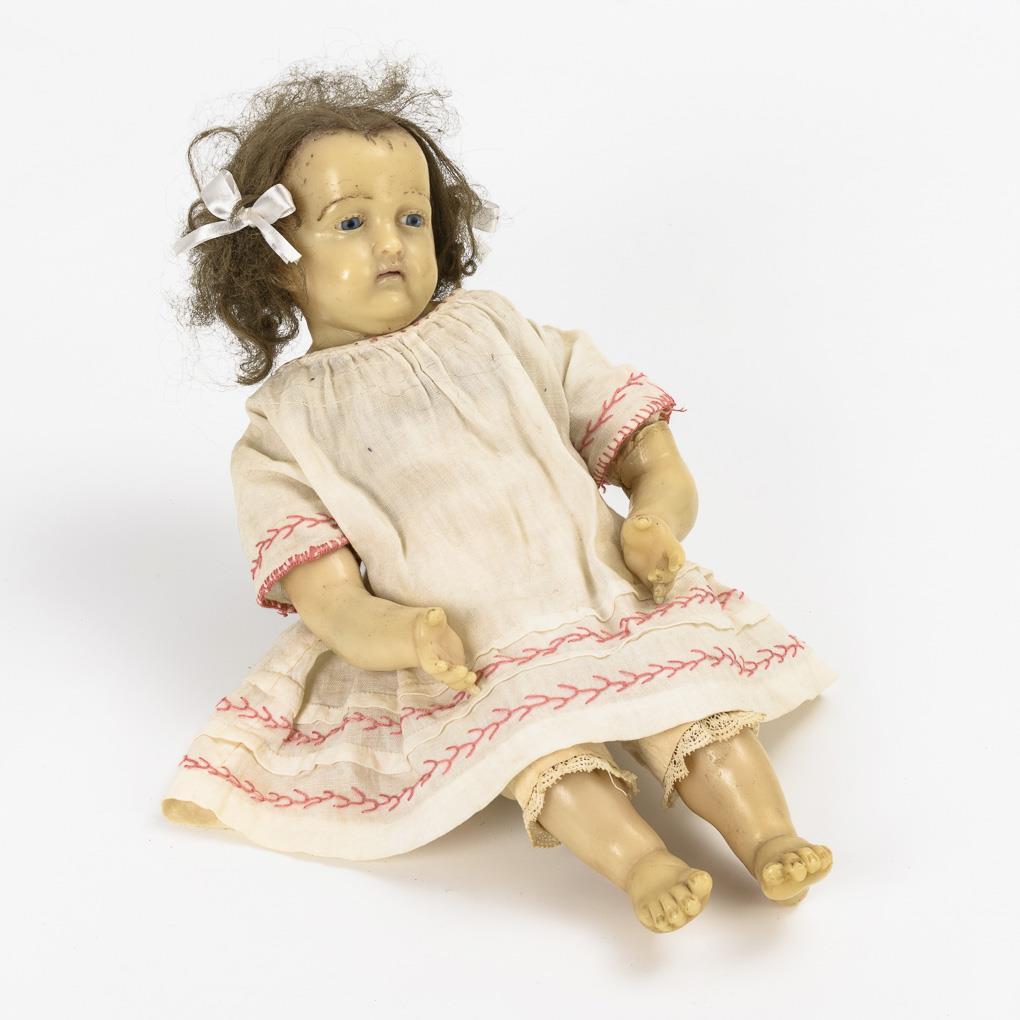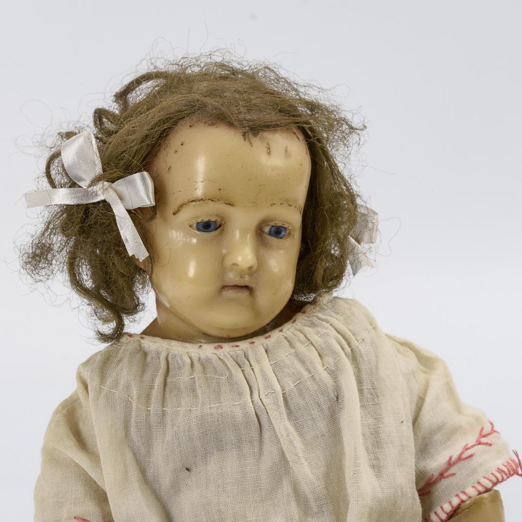 Chest head, inlaid blue glass eyes, brown mohair hair. Wood wool stuffed body with wax limbs. White shirt. Signs of age, repairs to the base of the chest and fingers.