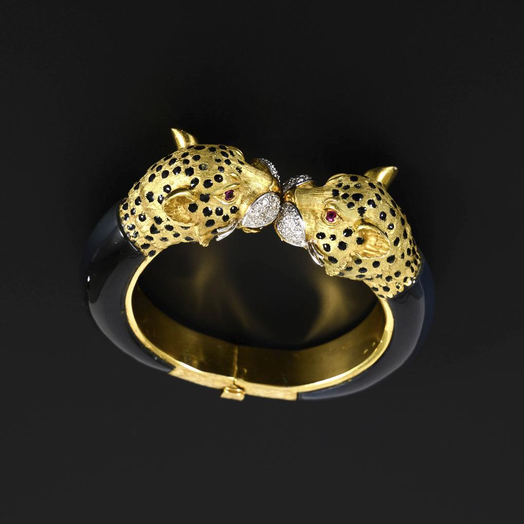 Heavy hinged hoop with a total of 56 pavé set diamonds and 4 rubies in full plastic partially enameled panther heads and applied stone segments. Hinged with bow clasp.