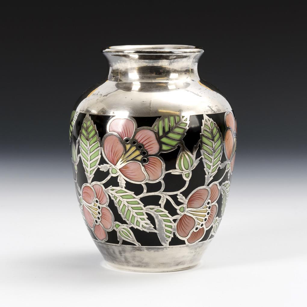 Baluster vase with silver overlay (1000 hallmarked) and colored flowers bordered by silver on black background.