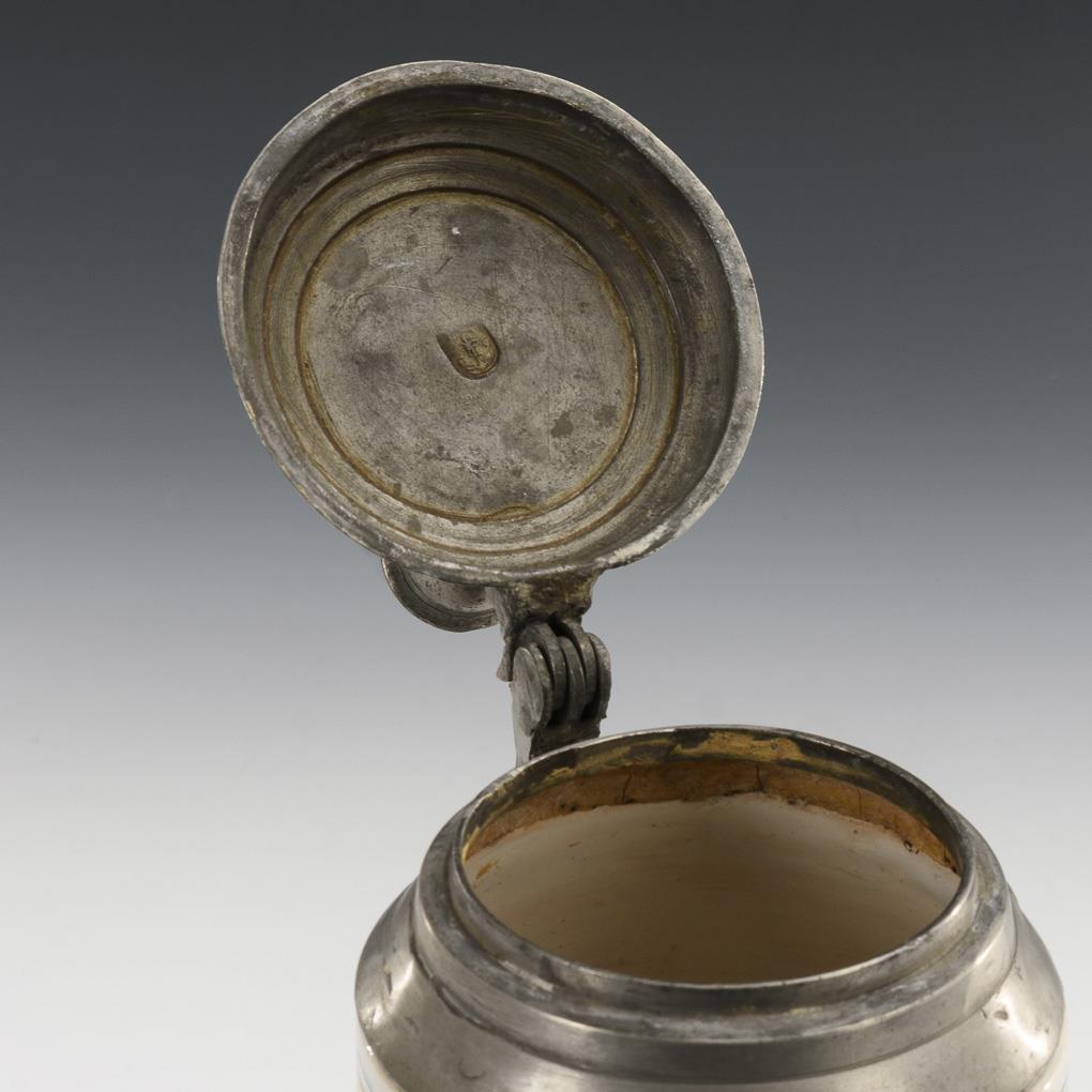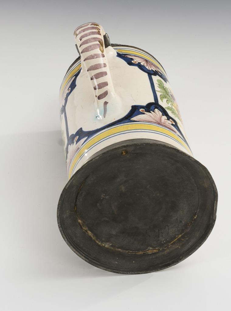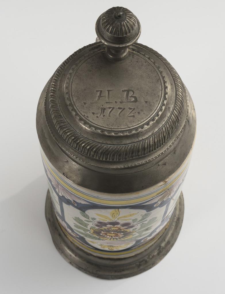 Cylindrical jug with line decorated ribbon handle. Circumferential 3 baroque reserves with large flowers. Profiled pewter lid with ball pusher, engraved "HB 1777", hallmarked inside, pewter stand. Wall crack, glaze rubbing and small bumps, signs of age and partial defects on the pewter.
