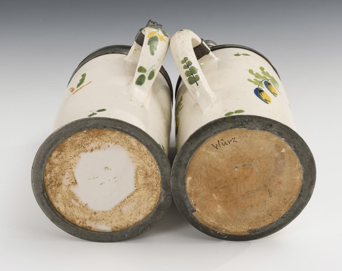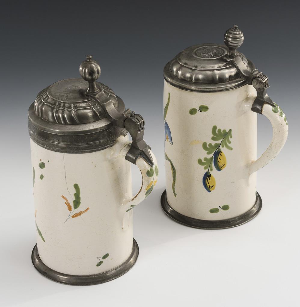 Cylinder jugs with floral decorated ribbon handles. 1x bird on a branch. 1x flower branch with carnation and tulips. Each with profiled pewter lid, ball pushers and engravings, pewter stand ring. With defects, partly restored, signs of age and use.