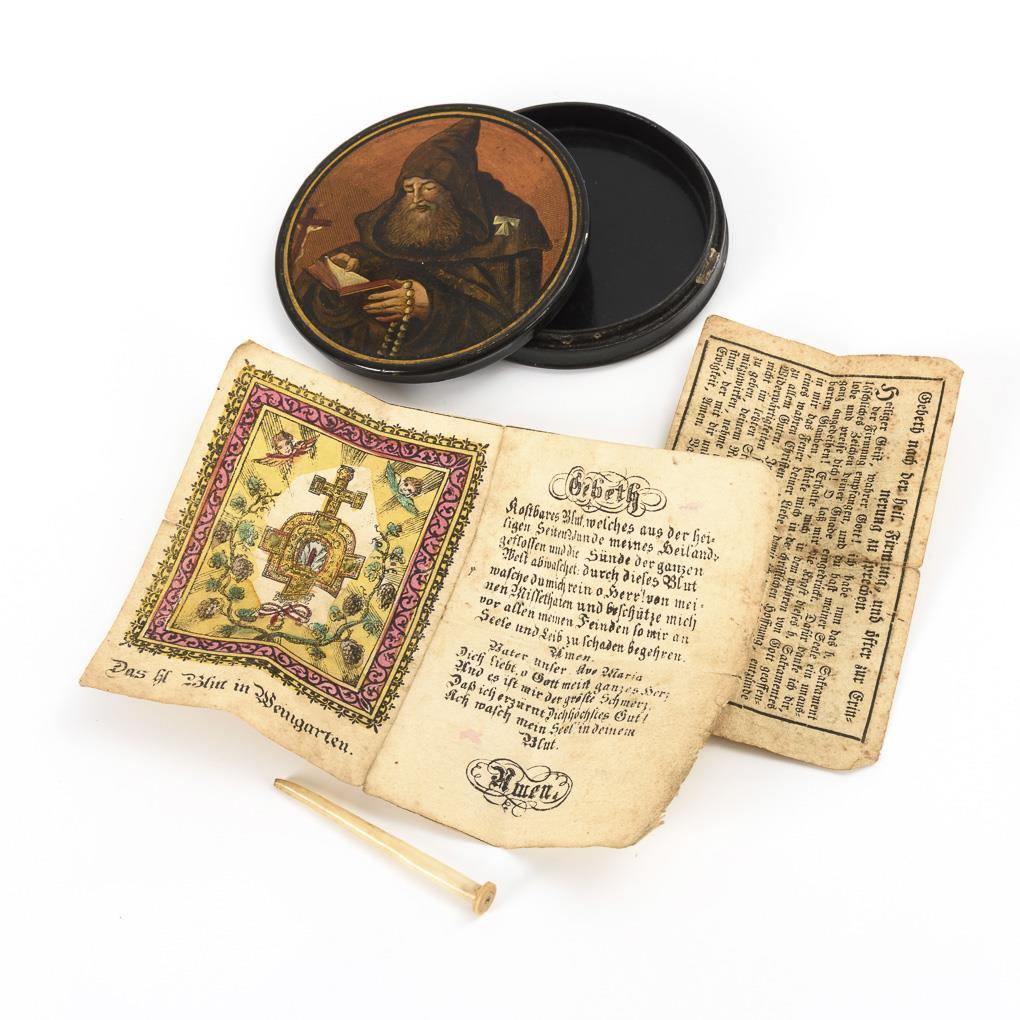 Biedermeier lacquer box with reading monk. In addition, quill egg dish and 2 prayer slips.