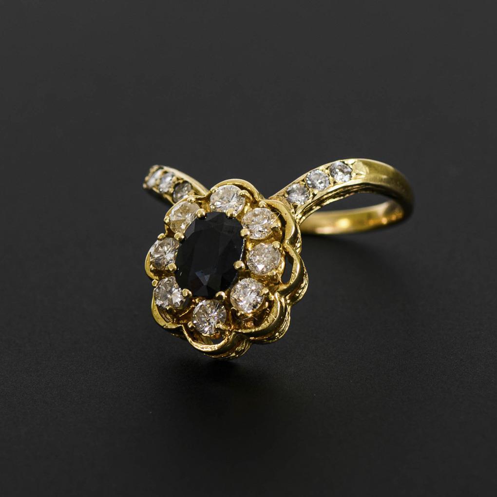 Claw-set sapphire surrounded by 8 brilliant-cut diamonds, on center rail with 6 small inset brilliant-cut diamonds.